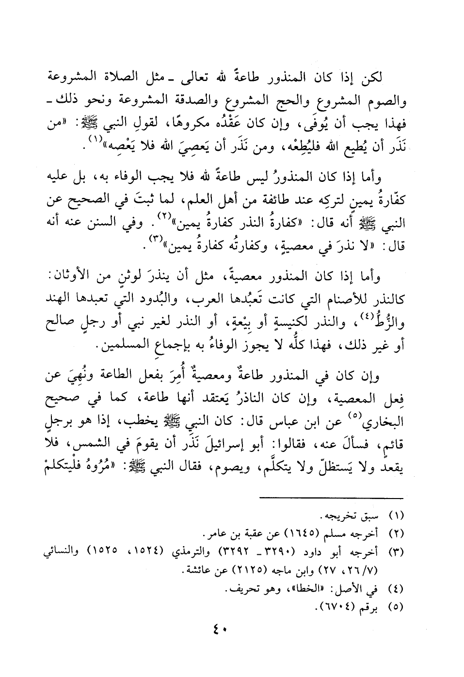 وأما إذا كان المنذورُ ليس طاعة لله فلا يجب الوفاء به، بل عليه كفّارةُ يمينٍ لتركِه عند طائفة من أهل العلم، لما ثبتَ في الصحيح عن النبي - صَلَّى اللَّهُ عَلَيْهِ وَسَلَّمَ - أنه قال: "كفارةُ النذر كفارةُ يمين" (2). وفي السنن عنه أنه قال: "لا نذرَ في معصية، وكفارتُه كفارةُ يمين" (3).