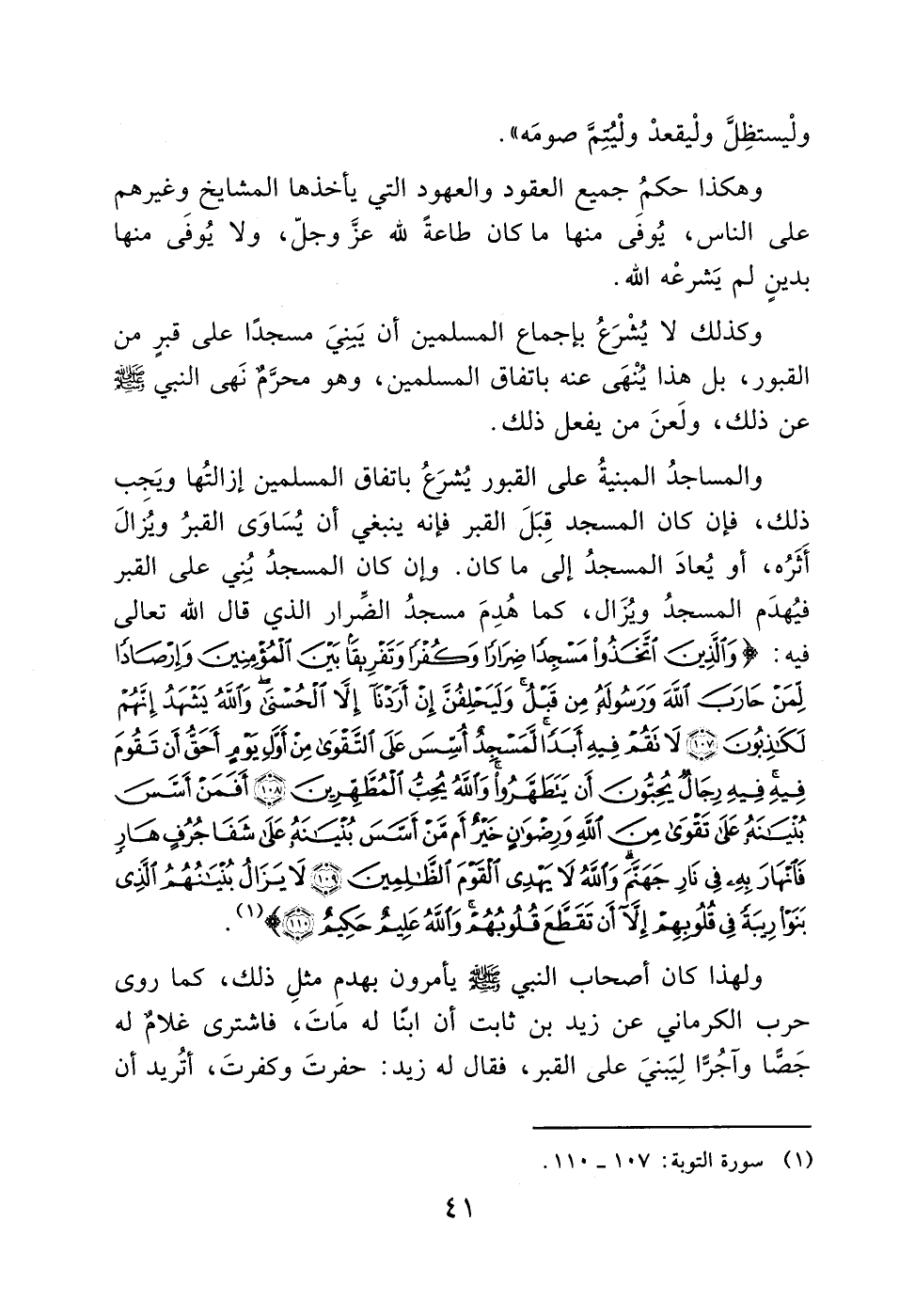 ولهذا كان أصحاب النبي - صَلَّى اللَّهُ عَلَيْهِ وَسَلَّمَ - يأمرون بهدمِ مثلِ ذلك، كما روى حرب الكرماني عن زيد بن ثابت أن ابنًا له ماتَ، فاشترى غلامٌ له جَضًا وآجُرًّا لِيَبنيَ على القبر، فقال له زيد: حفرتَ وكفرتَ، أتُريد أن