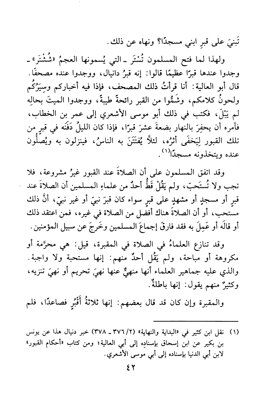 ولهذا لما فتح المسلمون تُسْتَر- التي يُسمونها العجمُ "شُشْتَر"- وجدوا عندها قبرًا عظيمًا قالوا: إنه قبرُ دانيال، ووجدوا عنده مصحفًا. قال أبو العالية: أنا قرأتُ ذلك المصحف، فإذا فيه أخباركم وسِيَرُكُم ولحونُ كلامكم، وشَمُّوا من القبر رائحةً طيبةً، ووجدوا الميتَ بحالِه لم يَبْلَ، فكتب في ذلك أبو موسى الأشعري إلى عمر بن الخطاب، فأمره أن يحفِرَ بالنهار بضعةَ عشرَ قبرًا، فإذا كان الليلُ دَفَنَه في قبرٍ من تلك القبور لِيَخفَى أثرُه، لئلا يُفتَتَنَ به الناسُ، فينزلون به ويُصلُّون عنده ويتخذونه مسجدًا (1).