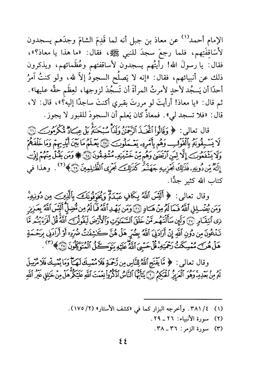 الإمام أحمد (1) عن معاذ بن جبل أنه لما قَدِمَ الشامَ وجدَهم يسجدون لأسَاقِفَتِهم، فلما رجعَ سجدَ النبي - صَلَّى اللَّهُ عَلَيْهِ وَسَلَّمَ -، فقال: "ما هذا يا معاذ؟ "، فقال: يا رسولَ الله! رأيتُهم يسجدون لأساقفتهم وعُظَمائهم، ويذكرون ذلك عن أنبيائهم، فقال: "إنه لا يَصلُح السجودُ إلا الله، ولو كنتُ آمرُ أحدًا أن يَسجُد لأحدٍ لأمرتُ المرأةَ أن تَسجُدَ لزوجها، لعِظَمِ حقَه عليها". ثم قال: "يا معاذ! أرأيتَ لو مررتَ بقبري أكنتَ ساجدًا إليه؟ "، قال: لا، قال: "فلا تسجد لي". فمعاذٌ كان يَعلم أن السجودَ للقبور لا يجوز.