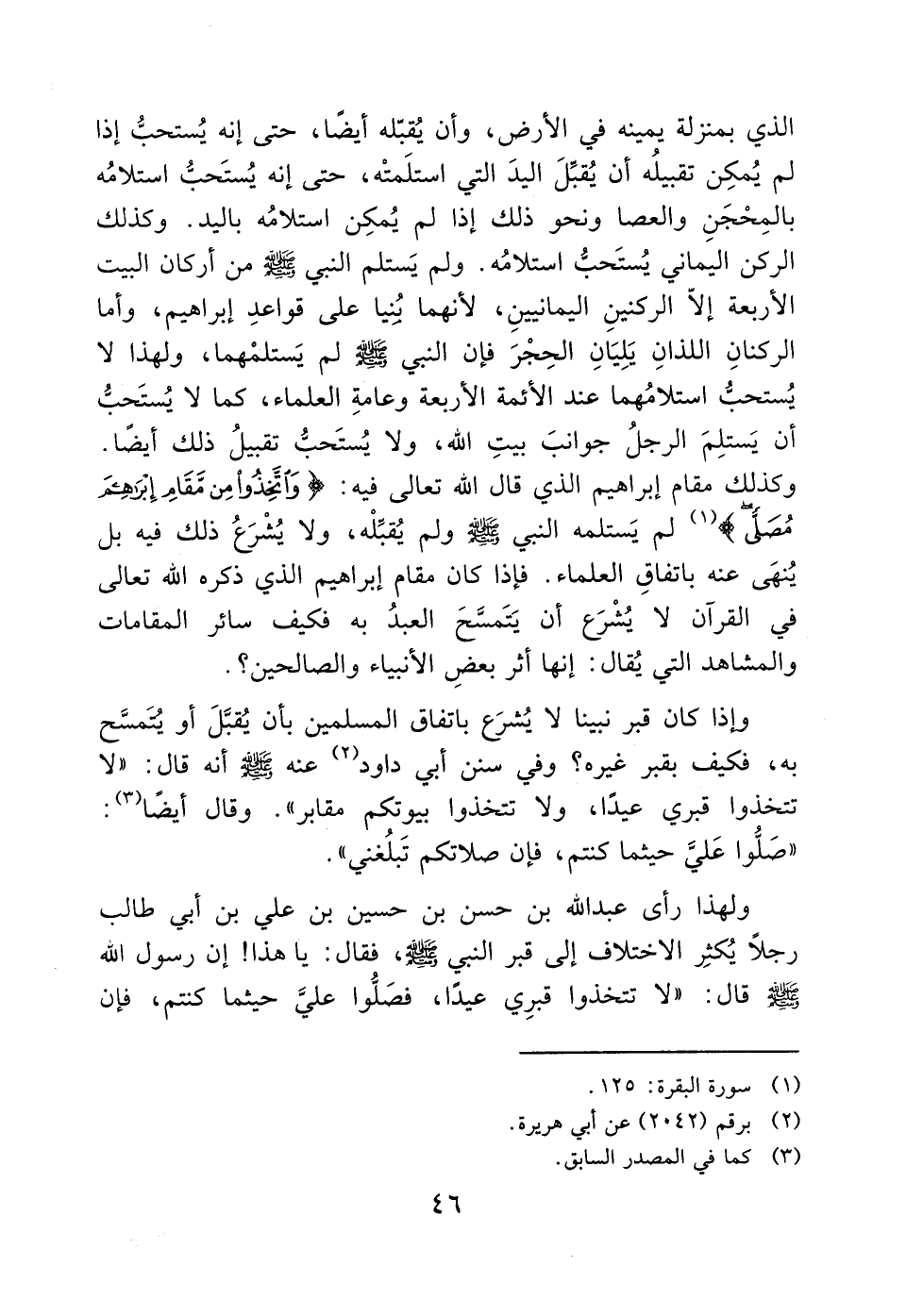 وكذلك مقام إبراهيم الذي قال الله تعالى فيه: (وَاتَّخِذُوا مِنْ مَقَامِ إِبْرَاهِيمَ مُصَلّىً) (1) لم يَستلمه النبي - صَلَّى اللَّهُ عَلَيْهِ وَسَلَّمَ - ولم يُقبِّلْه، ولا يُشْرَعُ ذلك فيه بل يُنهَى عنه باتفاقِ العلماء. فإذا كان مقام إبراهيم الذي ذكره الله تعالى في القرآن لا يُشْرَع أن يَتَمسَّحَ العبدُ به فكيف سائر المقامات والمشاهد التي يُقال: إنها أثر بعضِ الأنبياء والصالحين؟.