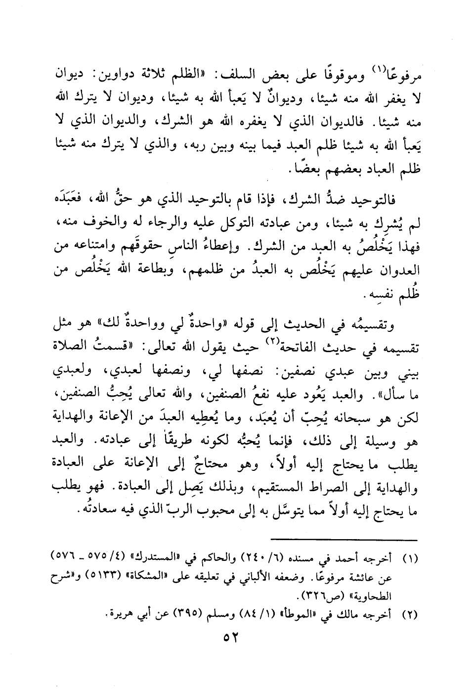 وتقسيمُه في الحديث إلى قوله "واحدةٌ لي وواحدة لك" هو مثل تقسيمه في حديث الفاتحة (2) حيث يقول الله تعالى: "قسمتُ الصلاة بيني وبين عبدي نصفين: نصفها لي، ونصفها لعبدي، ولعبدي ما سأل". والعبد يَعُود عليه نفعُ الصنفين، والله تعالى يُحِبُّ الصنفين، لكن هو سبحانه يُحِبّ أن يُعبَد، وما يُعطِيه العبدَ من الإعانة والهداية هو وسيلة إلى ذلك، فإنما يُحبُّه لكونه طريقًا إلى عبادته. والعبد يطلب ما يحتاج إليه أولاً، وهو محتاجٌ إلى الإعانة على العبادة والهداية إلى الصراط المستقيم، وبذلك يَصِل إلى العبادة. فهو يطلب ما يحتاج إليه أولاً مما يتوسَّل به إلى محبوب الربّ الذي فيه سعادتُه.