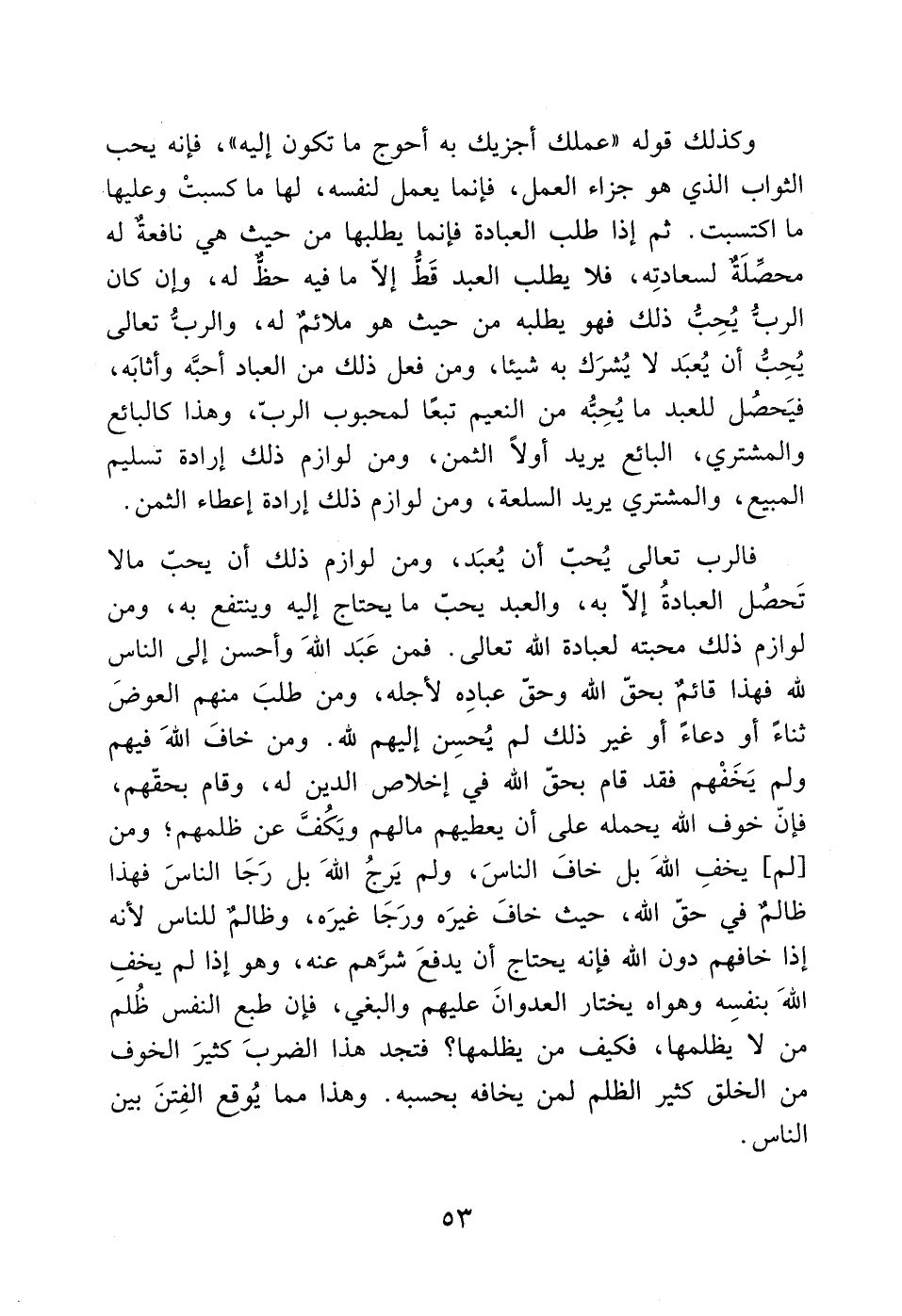 فالرب تعالى يُحبّ أن يُعبَد، ومن لوازم ذلك أن يحبّ مالا تَحصُل العبادةُ إلا به، والعبد يحبّ ما يحتاج إليه وينتفع به، ومن لوازم ذلك محبته لعبادة الله تعالى. فمن عَبَد اللهَ وأحسن إلى الناس لله فهذا قائم بحقّ الله وحقّ عبادِه لأجله، ومن طلبَ منهم العوضَ ثناءً أو دعاءً أو غير ذلك لم يُحسِن إليهم لله. ومن خافَ اللهَ فيهم ولم يَخَفْهم فقد قام بحقّ الله في إخلاص الدين له، وقام بحقّهم، فإنّ خوف الله يحمله على أن يعطيهم مالهم ويَكُفَّ عن ظلمهم؛ ومن [لم] يخفِ اللهَ بل خافَ الناسَ، ولم يَرجُ الله بل رَجَا الناسَ فهذا ظالم في حق الله، حيث خافَ غيرَه ورَجَا غيرَه، وظالم للناس لأنه إذا خافهم دون الله فإنه يحتاج أن يدفعَ شرَّهم عنه، وهو إذا لم يخفِ اللهَ بنفسِه وهواه يختار العدوانَ عليهم والبغي، فإن طبع النفس ظُلم من لا يظلمها، فكيف من يظلمها؟ فتجد هذا الضربَ كثيرَ الخوف من الخلق كثير الظلم لمن يخافه بحسبه. وهذا مما يُوقع الفِتنَ بين الناس.