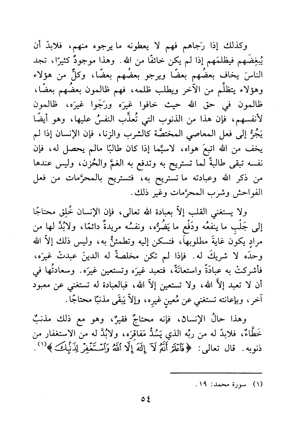 ولا يستغني القلب إلا بعبادة الله تعالى، فإن الإنسان خُلِق محتاجًا إلى جَلْبِ ما ينفعُه ودَفْع ما يَضُرُّه، ونفسُه مريدةٌ دائمًا، ولابُدَّ لها من مرادٍ يكوَن غايةَ مطلوبهَا، فتسكن إليه وتطمئنُّ به، وليس ذلك إلا الله وحدَه لا شريكَ له. فإذا لم تكن مخلصةً له الدينَ عبدتْ غيرَه، فأشركتْ به عبادَةً واستعانَةً، فتعبد غيرَه وتستعين غيرَه. وسعادتُها في أن لا تعبد إلا الله، ولا تستعين إلا الله، فبالعبادة له تستغني عن معبود آخر، وبإعانته تستغني عن مُعينٍ غيرِه، وإلاّ يَبقَى مذنبًا محتاجًا.