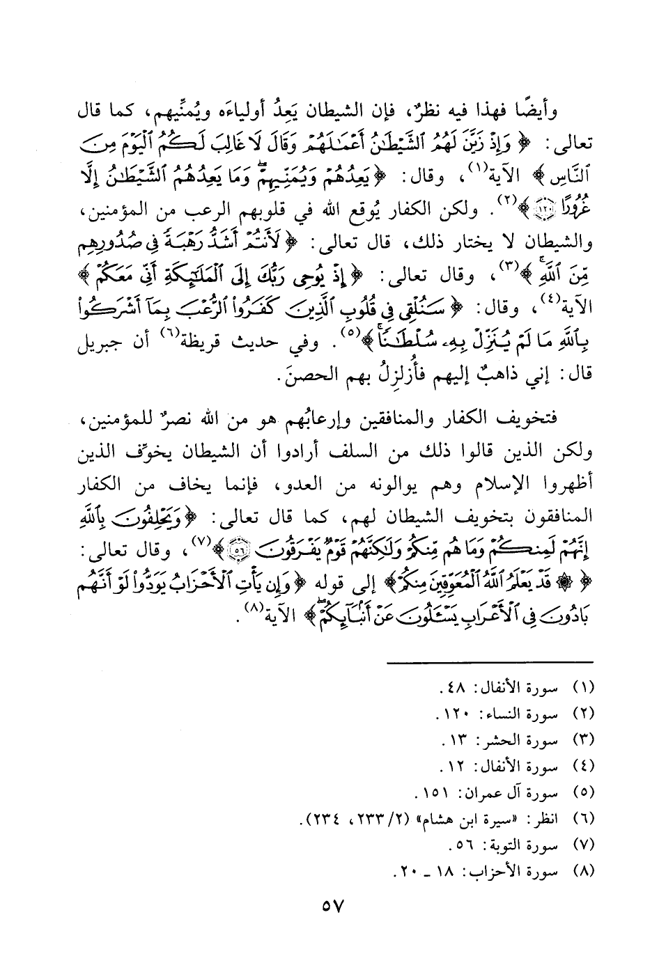 وأيضًا فهذا فيه نظرٌ، فإن الشيطان يَعِدُ أولياءَه ويمنِّيهم، كما قال تعالى: (وَإِذْ زَيَّنَ لَهُمُ الشَّيْطَانُ أَعْمَالَهُمْ وَقَالَ لا غَالِبَ لَكُمُ الْيَوْمَ مِنَ النَّاسِ) الآية (1)، وقال: (يَعِدُهُمْ وَيُمَنِّيهِمْ وَمَا يَعِدُهُمُ الشَّيْطَانُ إِلَّا غُرُوراً (120)) (2). ولكن الكفار يُوقع الله في قلوبهم الرعب من المؤمنين، والشيطان لا يختار ذلك، قال تعالى: (لَأَنْتُمْ أَشَدُّ رَهْبَةً فِي صُدُورِهِمْ مِنَ اللَّهِ) (3)، وقال تعالى: (إِذْ يُوحِي رَبُّكَ إِلَى الْمَلائِكَةِ أَنِّي مَعَكُمْ) الآية (4)، وقال: (سَنُلْقِي فِي قُلُوبِ الَّذِينَ كَفَرُوا الرُّعْبَ بِمَا أَشْرَكُوا بِاللَّهِ مَا لَمْ يُنَزِّلْ بِهِ سُلْطَاناً) (5). وفي حديث قريظة (6) أن جبريل قال: إني ذاهبٌ إليهم فأُزلزِلُ بهم الحصنَ.