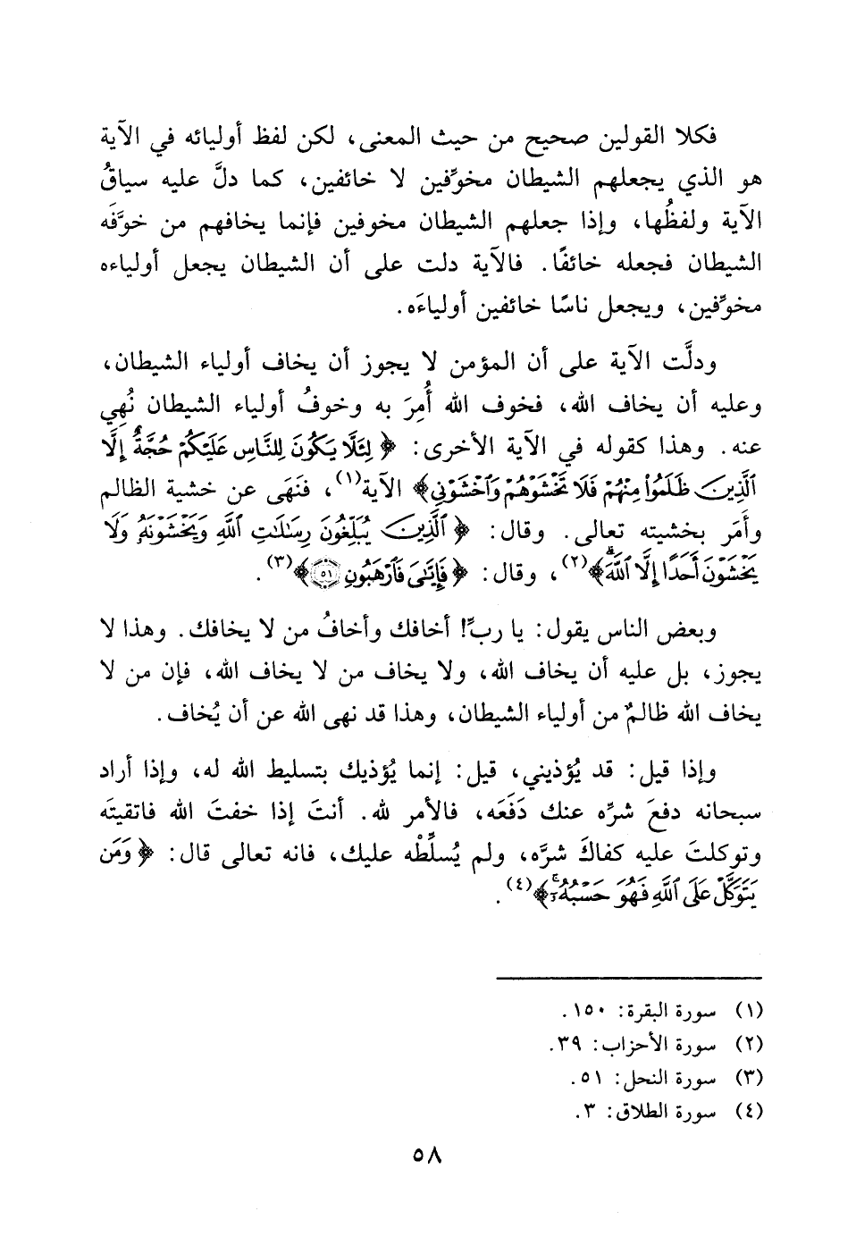ودلَّت الآية على أن المؤمن لا يجوز أن يخاف أولياء الشيطان، وعليه أن يخاف الله، فخوف الله أُمِرَ به وخوفُ أولياء الشيطان نُهِي عنه. وهذا كقوله في الآية الأخرى: (لِئَلَّا يَكُونَ لِلنَّاسِ عَلَيْكُمْ حُجَّةٌ إِلَّا الَّذِينَ ظَلَمُوا مِنْهُمْ) الآية (1)، فنَهَى عن خشية الظالم وأَمَر بخشيته تعالى. وقال: (الَّذِينَ يُبَلِّغُونَ رِسَالاتِ اللَّهِ وَيَخْشَوْنَهُ وَلا يَخْشَوْنَ أَحَداً إِلَّا اللَّهَ) (2)، وقال: (فَإِيَّايَ فَارْهَبُونِ (51)) (3).