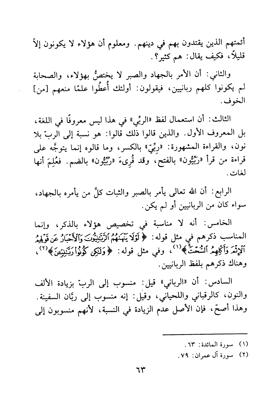 السادس: أن "الرباني" قيل: منسوب إلى الربّ بزيادة الألف والنون، كالرقباني واللحياني، وقيل: إنه منسوب إلى ربَّان السفينة.