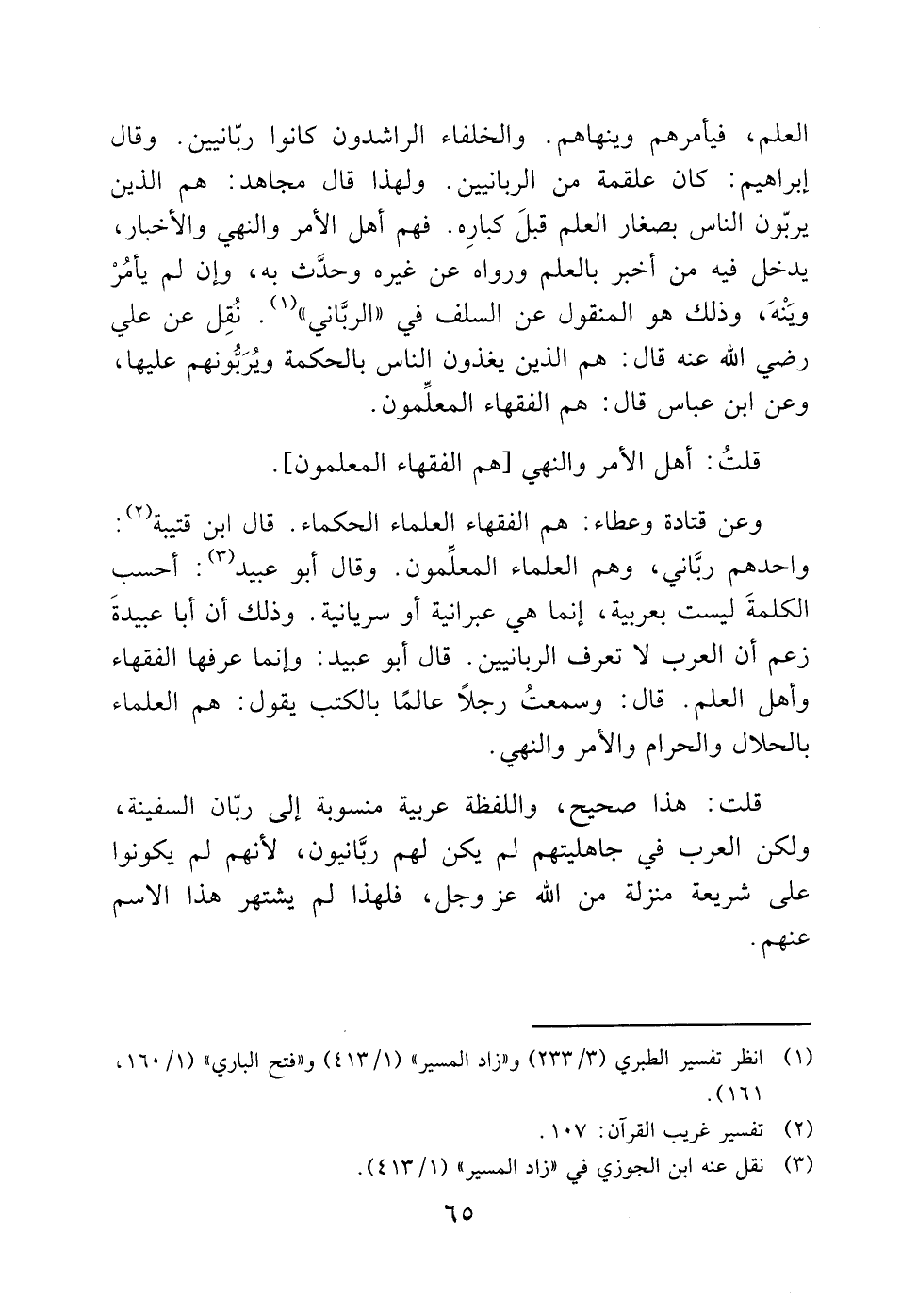 قلت: هذا صحيح، واللفظة عربية منسوبة إلى ربّان السفينة، ولكن العرب في جاهليتهم لم يكن لهم ربَّانيون، لأنهم لم يكونوا على شريعة منزلة من الله عز وجل، فلهذا لم يشتهر هذا الاسم عنهم.