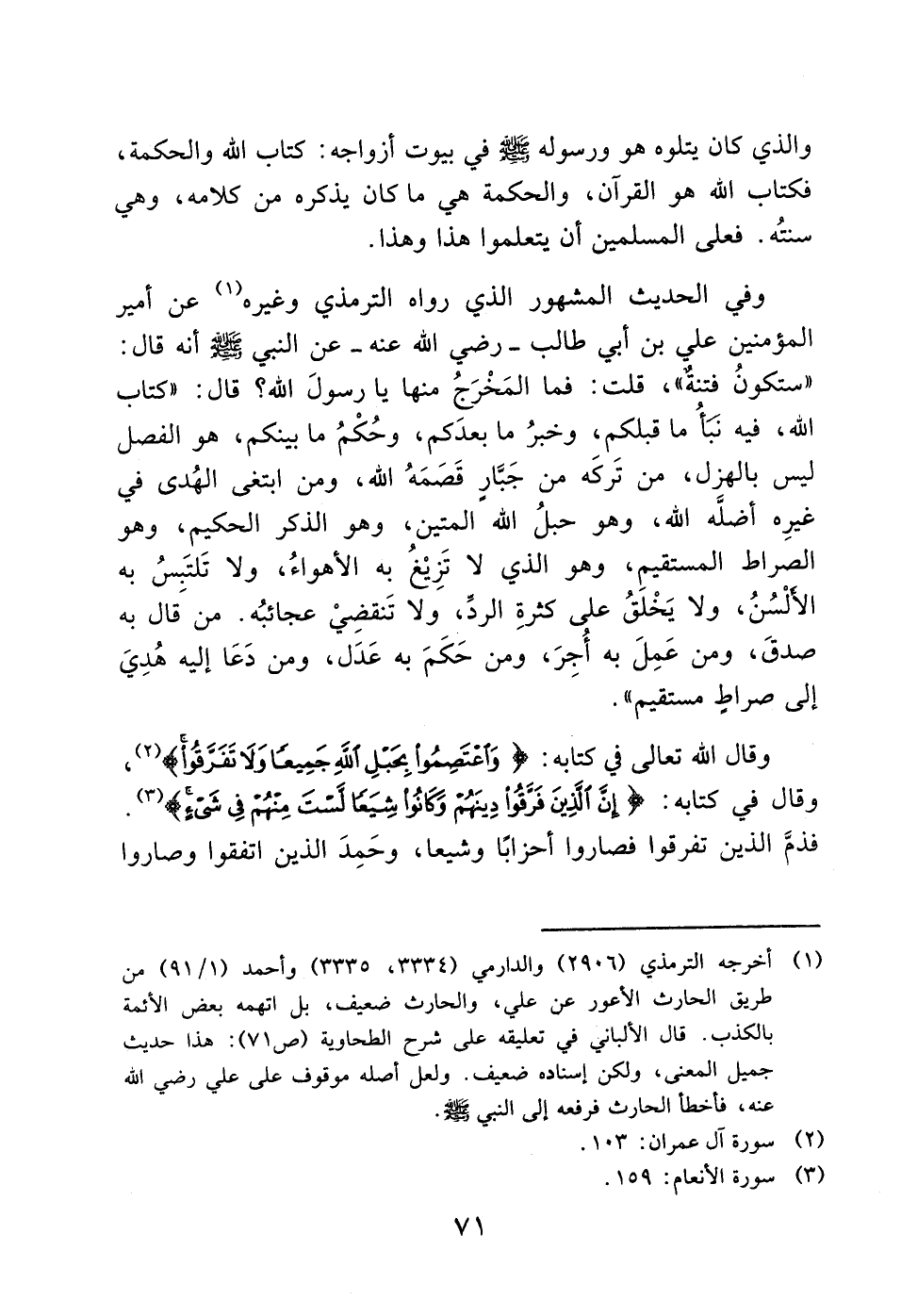 (1) أخرجه الترمذي (2906) والدارمي (3334، 3335) وأحمد (1/ 91) من طريق الحارث الأعور عن علي، والحارث ضعيف، بل اتهمه بعض الأئمة بالكذب. قال الألباني في تعليقه على شرح الطحاوية (ص 71): هذا حديث جميل المعنى، ولكن إسناده ضعيف. ولعل أصله موقوف على علي رضي الله عنه، فأخطأ الحارث فرفعه إلى النبي - صَلَّى اللَّهُ عَلَيْهِ وَسَلَّمَ -.