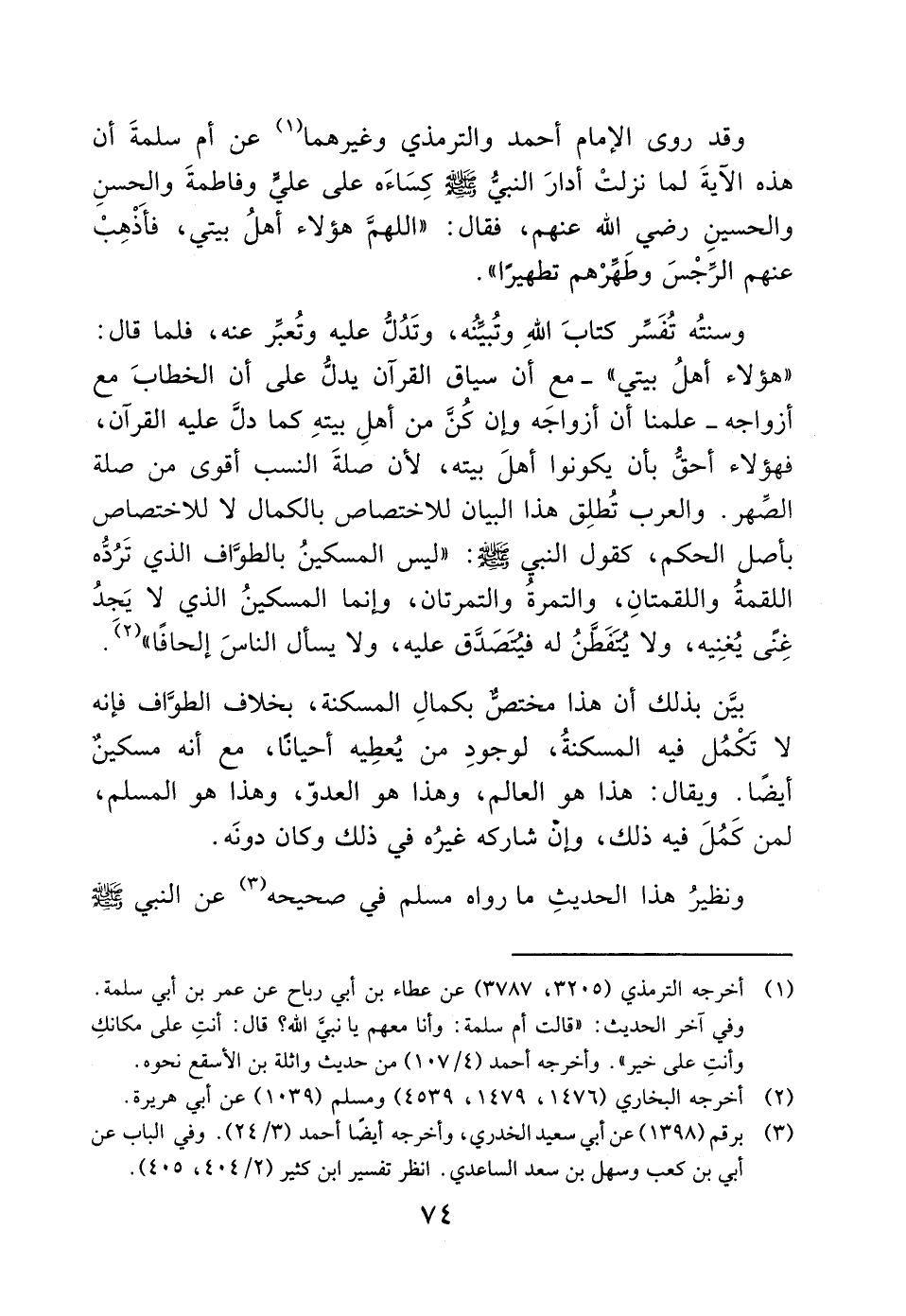 وسنتُه تُفَسِّر كتابَ الله وتُبيِّنُه، وتَدُلُّ عليه وتُعبِّر عنه، فلما قال: "هؤلاء أهلُ بيتي" -مع أن سياق القرآن يدلُّ على أن الخطابَ مع أزواجه-علمنا أن أزواجَه وإن كُن من أهلِ بيتهِ كما دلَّ عليه القرآن، فهؤلاء أحق بأن يكونوا أهلَ بيته، لأن صلةَ النسب أقوى من صلة الصِّهر. والعرب تُطلِق هذا البيان للاختصاص بالكمال لا للاختصاص بأصل الحكم، كقول النبي - صَلَّى اللَّهُ عَلَيْهِ وَسَلَّمَ -: "ليس المسكينُ بالطوَّاف الذي تَرُدُّه اللقمةُ واللقمتانِ، والتمرة والتمرتان، وإنما المسكينُ الذي لا يَجدُ غِنىً يُغنِيه، ولا يتَفَطَّنُ له فيُتَصَدَّق عليه، ولا يسأل الناسَ إلحافًا" (2).