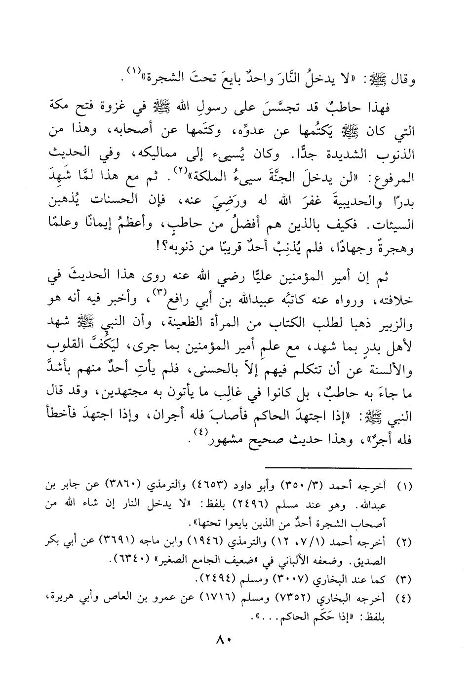 فهذا حاطبٌ قد تجسَّسَ على رسولِ الله - صَلَّى اللَّهُ عَلَيْهِ وَسَلَّمَ - في غزوة فتح مكة التي كان - صَلَّى اللَّهُ عَلَيْهِ وَسَلَّمَ - يَكتُمها عن عدوِّه، وكتَمها عن أصحابه، وهذا من الذنوب الشديدة جدًّا. وكان يُسيء إلى مماليكه، وفي الحديث المرفوع: "لن يدخلَ الجنَّةَ سيئُ الملكة" (2). ثم مع هذا لمَّا شَهِدَ بدرًا والحديبيةَ غفرَ الله له ورَضِيَ عنه، فإن الحسنات يُذهبن السيئات. فكيف بالذين هم أفضلُ من حاطبٍ، وأعظمُ إيمانًا وعلمًا وهجرةً وجهادًا، فلم يُدْنِبْ أحدٌ قريبًا من ذنوبه؟!