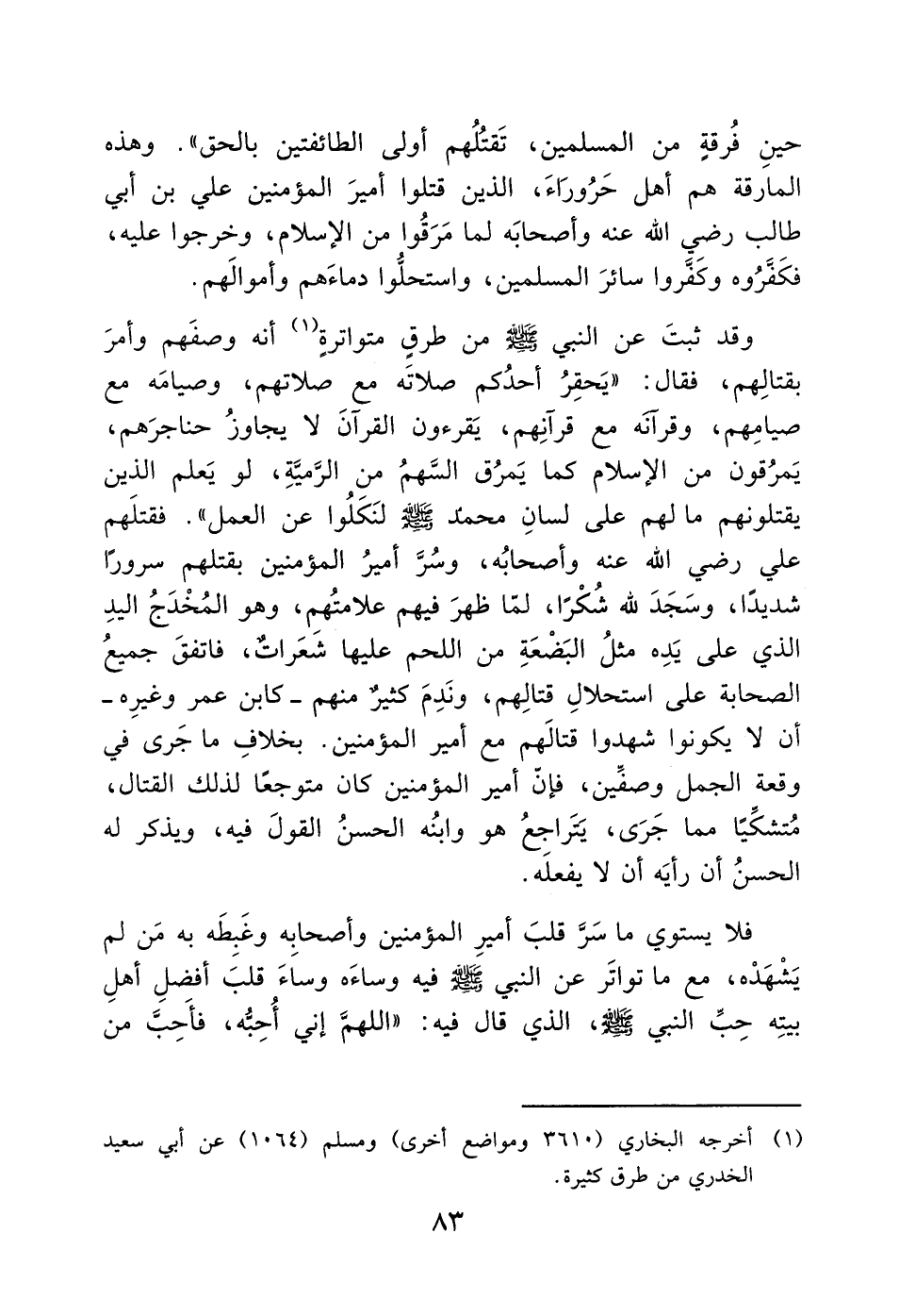 وقد ثبتَ عن النبي - صَلَّى اللَّهُ عَلَيْهِ وَسَلَّمَ - من طرقٍ متواترةٍ (1) أنه وصفَهم وأمرَ بقتالِهم، فقال: "يَحقِرُ أحدُكم صلاتَه مع صلاتهم، وصيامَه مع صيامِهم، وقرأنه مع قرآنِهم، يَقرءون القرآنَ لا يجاوزُ حناجرَهم، يَمرُقون من الإسلام كما يَمرُق السَّهمُ من الرَّميَّةِ، لو يَعلم الذين يقتلونهم مالهم على لسانِ محمد - صَلَّى اللَّهُ عَلَيْهِ وَسَلَّمَ - لنَكَلُوا عن العمل". فقتلَهم علي رضي الله عنه وأصحابُه، وسُرَّ أميرُ المؤمنين بقتلهم سرورًا شديدًا، وسَجَدَ الله شُكْرًا، لمّا ظهرَ فيهم علامتُهم، وهو المُخْدَجُ اليدِ الذي على يَدِه مثلُ البَضْعَةِ من اللحم عليها شَعَراتٌ، فاتفقَ جميعُ الصحابة على استحلالِ قتالِهم، ونَدِمَ كثير منهم -كابن عمر وغيرِه- أن لا يكونوا شهدوا قتالَهم مع أمير المؤمنين. بخلافِ ما جَرى في وقعة الجمل وصفِّين، فإنّ أمير المؤمنين كان متوجعًا لذلك القتال، مُتشكِّيًا مما جَرَى، يَتَراجِعُ هو وابنُه الحسنُ القولَ فيه، ويذكر له الحسنُ أن رأيَه أن لا يفعله.