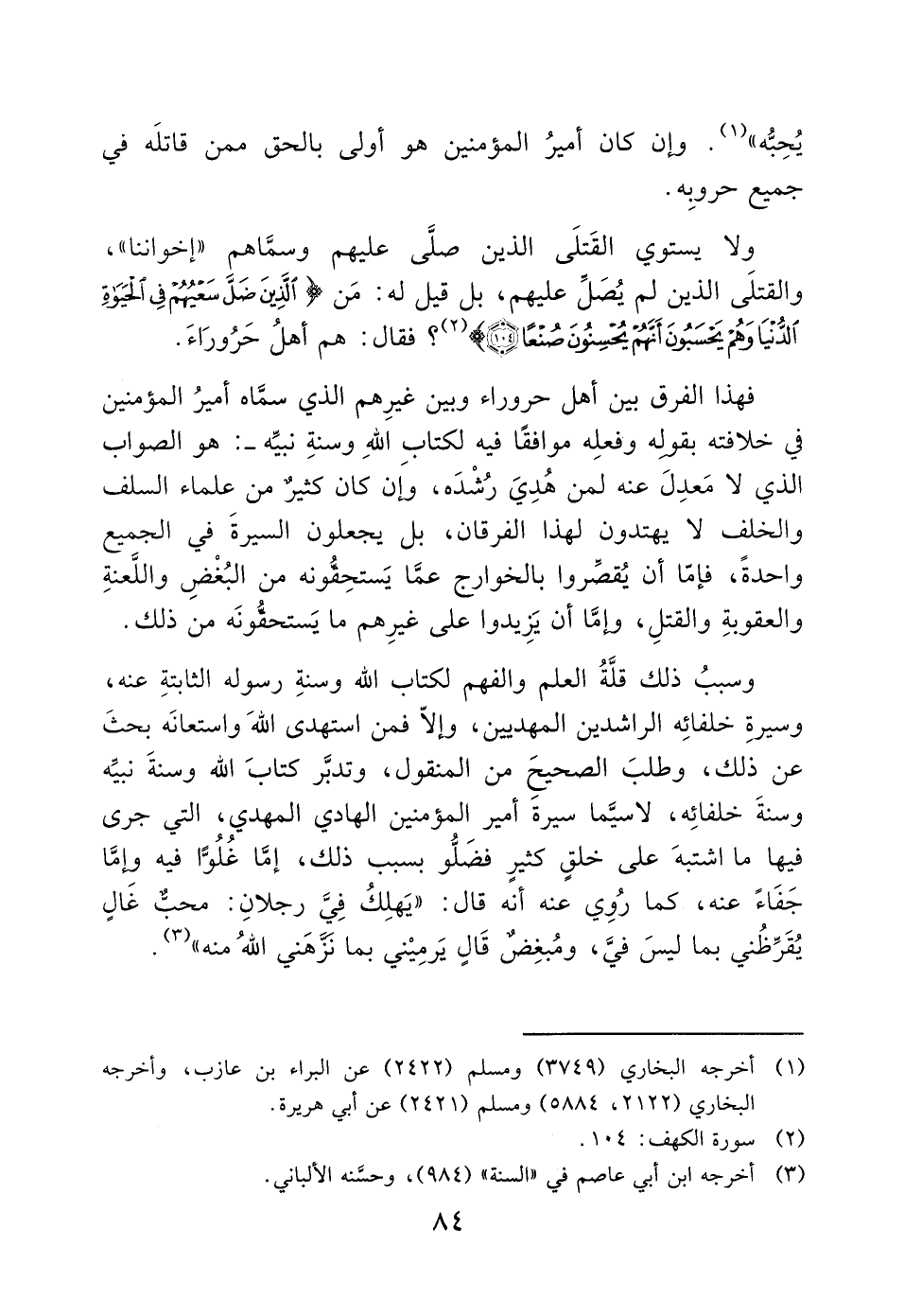 ولا يستوي القَتلَى الذين صلَّى عليهم وسمَّاهم "إخواننا"، والقتلَى الذين لم يُصَلِّ عليهم، بل قيل له: مَن (الَّذِينَ ضَلَّ سَعْيُهُمْ فِي الْحَيَاةِ الدُّنْيَا وَهُمْ يَحْسَبُونَ أَنَّهُمْ يُحْسِنُونَ صُنْعاً (104)) (2)؟ فقال: هم أهلُ حَرُورَاءَ.