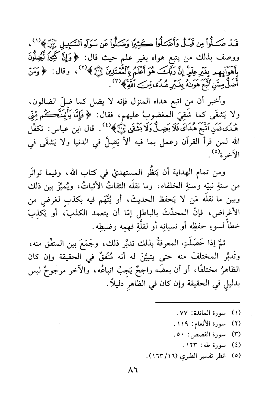 ومن تمام الهداية أن يَنظُر المستهديْ في كتاب الله، وفيما تواتَر من سنةِ نبيه وسنةِ الخلفاء، وما نقلَه الثقاتُ الأثباتُ، ويُميِّزَ بين ذلك وبين ما نقلَه مَن لا يَحفظ الحديثَ، أو يُتَّهَم فيه بكذب لغرضٍ من الأغراض، فإنّ المحدِّثَ بالباطل إمَّا أن يتعمد الكذبَ، أو يَكذِبَ خطأً لسوءِ حفظِه أو نسيانِه أو لقلَّةِ فهمِه وضبطِه.