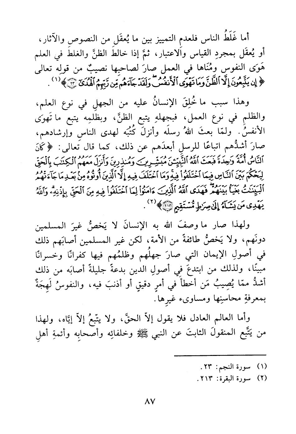 وأما العالم العادل فلا يقول إلا الحقَّ، ولا يتّبعُ إلا إيَّاه، ولهذا من يَتَّبع المنقولَ الثابتَ عن النبي - صَلَّى اللَّهُ عَلَيْهِ وَسَلَّمَ - وخلفائِه وأصحابِه وأئمةِ أهلِ
