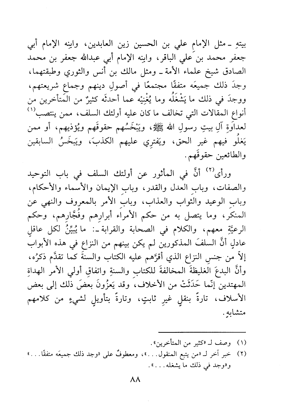ورأى (2) أنَ في المأثور عن أولئك السلف في باب التوحيد والصفات، وباب العدل والقدر، وباب الإيمان والأسماء والأحكام، وباب الوعيد والثَّواب والعذاب، وبابَ الأمر بالمعروف والنهي عن المنكَر، وما يتصل به من حكم الأمراَء أبرارِهم وفُجَّارِهم، وحكم الرعيَّةِ معهم، والكلام في الصحابة والقرابة-: ما يُبيِّنُ لكل عاقلٍ عادلٍ أنَّ السلفَ المذكورين لم يكن بينهم من النزاع في هذه الأبواب إلا من جنسِ النزاع الذي أقرَّهم عليه الكتاب والسنةَ كما تقدَّم ذكرُه، وأنَّ البدعَ الغليظةَ المخالفةَ للكتابِ والسنةِ واتفاقِ أولي الأمر الهداةِ المهتدين إنّما حَدَثَتْ من الأخلاف، وقد يَعزُونَ بعضَ ذلك إلى بعض الأسلاف، تارةً بنقل غيرِ ثابتٍ، وتارةً بتأويلٍ لشيءٍ من كلامهم متشابهٍ.