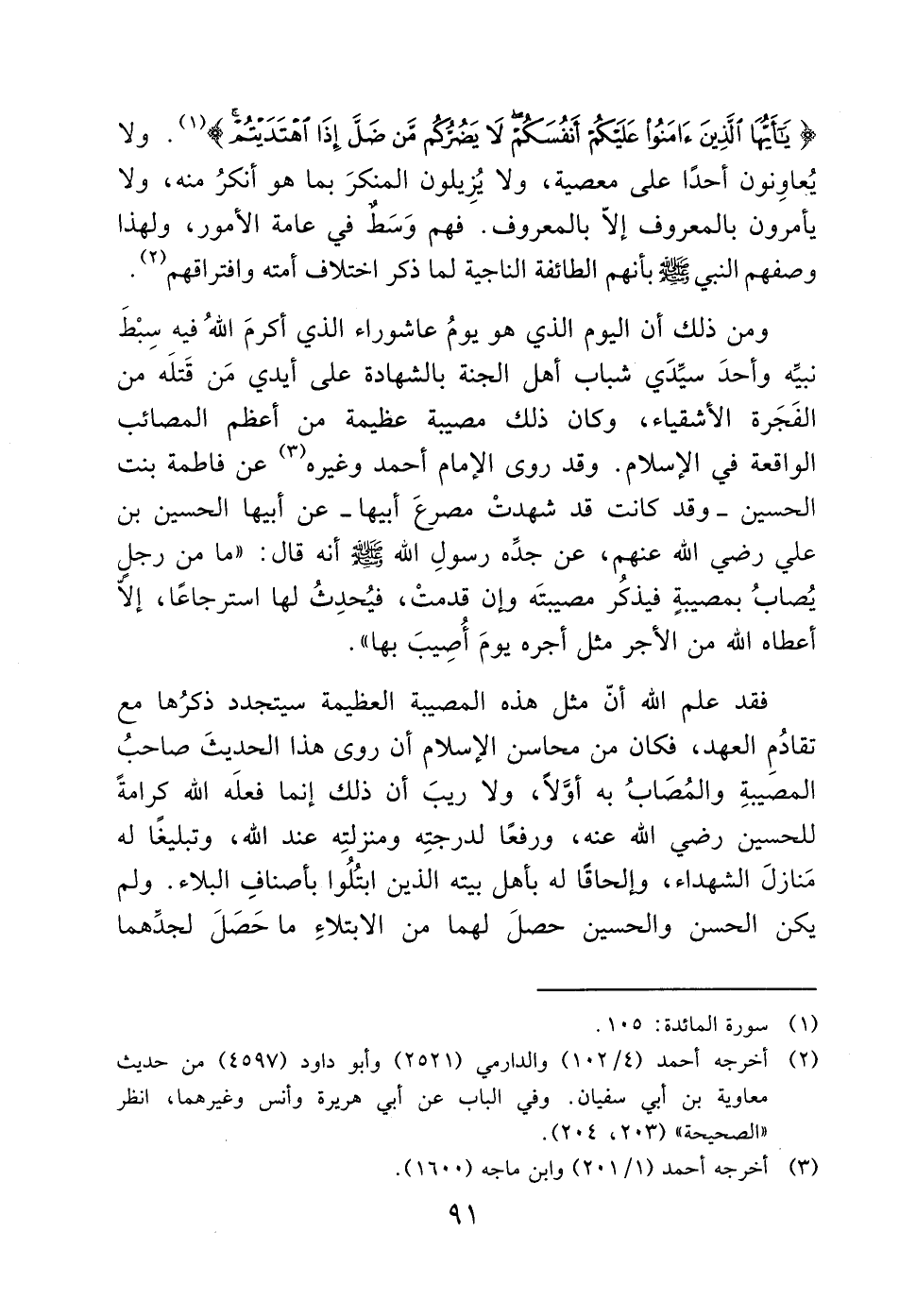 (يَا أَيُّهَا الَّذِينَ آمَنُوا عَلَيْكُمْ أَنْفُسَكُمْ لا يَضُرُّكُمْ مَنْ ضَلَّ إِذَا اهْتَدَيْتُمْ) (1). ولا يُعاوِنون أحدًا على معصية، ولا يُزِيلون المنكرَ بما هو أنكرُ منه، ولا يأمرون بالمعروف إلا بالمعروف. فهم وَسَط في عامة الأمور، ولهذا وصفهم النبي - صَلَّى اللَّهُ عَلَيْهِ وَسَلَّمَ - بأنهم الطائفة الناجية لما ذكر اختلاف أمته وافتراقهم (2).