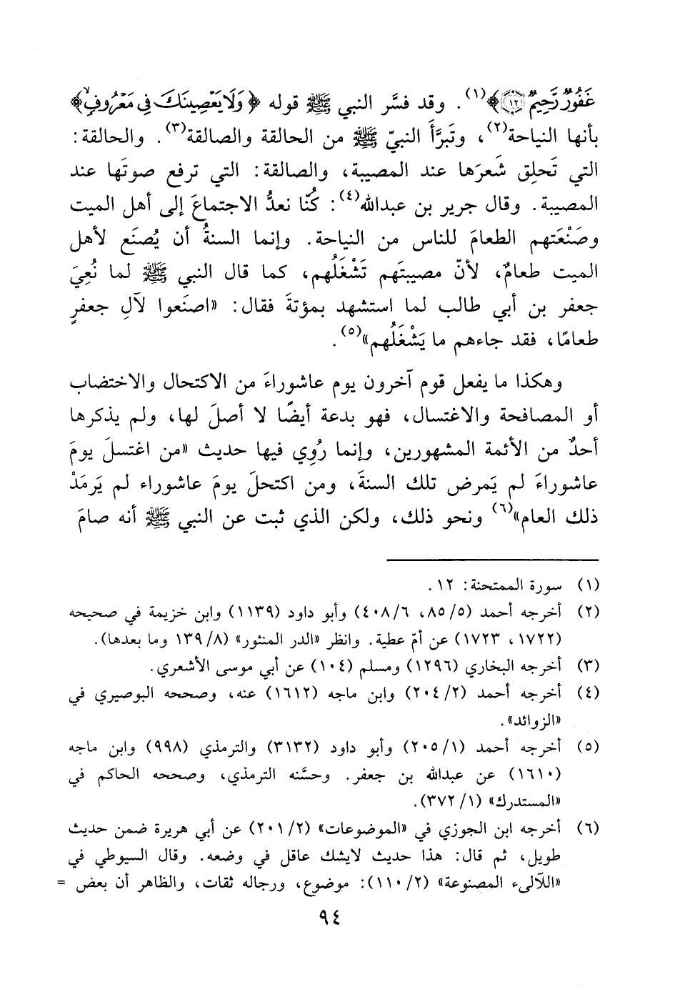 غَفُورٌ رَحِيمٌ (12)) (1). وقد فسَّر النبي - صَلَّى اللَّهُ عَلَيْهِ وَسَلَّمَ - قوله (وَلا يَعْصِينَكَ فِي مَعْرُوفٍ) بأنها النياحة (2)، وتَبرَّأَ النبيّ - صَلَّى اللَّهُ عَلَيْهِ وَسَلَّمَ - من الحالقة والصالقة (3). والحالقة: التي تَحلِق شَعرَها عند المصيبة، والصالقة: التي ترفع صوتَها عند المصيبة. وقال جرير بن عبد الله (4): كنا نعدُّ الاجتماعَ إلى أهل الميت وصَنْعَتهم الطعامَ للناس من النياحة. وإنما السنةُ أن يُصنَع لأهل الميت طعامٌ، لأنّ مصيبتَهم تَشْغَلُهم، كما قال النبي - صَلَّى اللَّهُ عَلَيْهِ وَسَلَّمَ - لما نُعِيَ جعفر بن أبي طالب لما استشهد بمؤتةَ فقال: "اصنَعوا لآلِ جعفرٍ طعامًا، فقد جاءهم ما يَشْغَلُهم" (5).