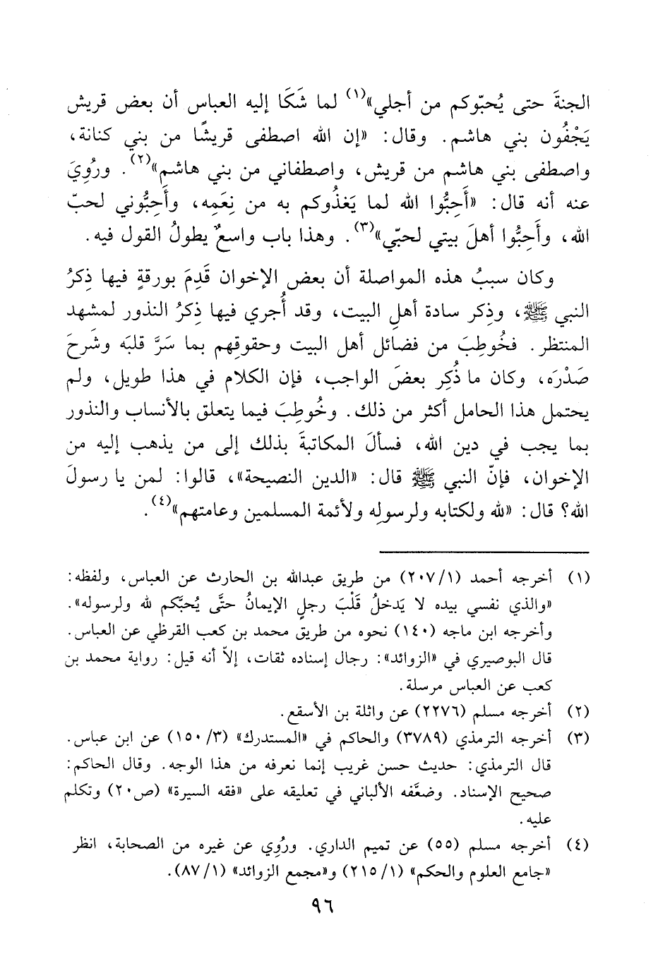وكان سببُ هذه المواصلة أن بعض الإخوان قَدِمَ بورقةٍ فيها ذِكرُ النبي - صَلَّى اللَّهُ عَلَيْهِ وَسَلَّمَ -، وذِكر سادة أهلِ البيت، وقد أُجري فيها ذِكرُ النذور لمشهد المنتظر. فخُوطِبَ من فضائل أهل البيت وحقوقِهم بما سَرَّ قلبَه وشَرحَ صَدْرَه، وكان ما ذُكِر بعضَ الواجب، فإن الكلام في هذا طويل، ولم يحتمل هذا الحامل أكثر من ذلك. وخُوطِبَ فيما يتعلق بالأنساب والنذور بما يجب في دين الله، فسألَ المكاتبةَ بذلك إلى من يذهب إليه من الإخوان، فإنّ النبي - صَلَّى اللَّهُ عَلَيْهِ وَسَلَّمَ - قال: "الدين النصيحة"، قالوا: لمن يا رسولَ الله؟ قال: "لله ولكتابه ولرسوله ولأئمة المسلمين وعامتهم" (4).