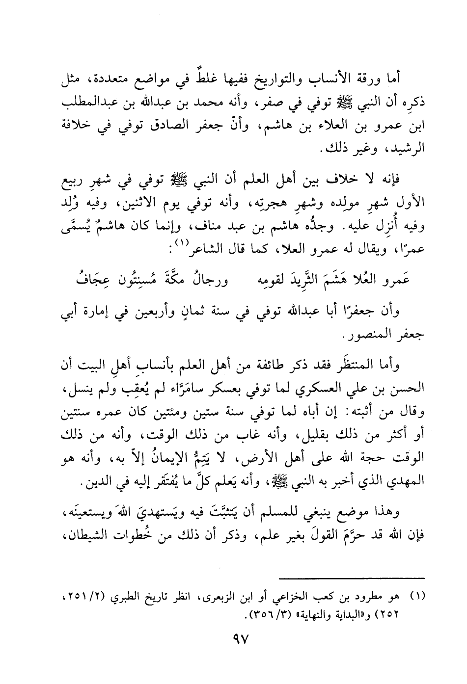 فإنه لا خلاف بين أهل العلم أن النبي - صَلَّى اللَّهُ عَلَيْهِ وَسَلَّمَ - توفي في شهرِ ربيع الأول شهرِ مولده وشهرِ هجرته، وأنه توفي يوم الاثنين، وفيه وُلِد وفيه أُنزِل عليه. وجدُّه هاشم بن عبد مناف، وإنما كان هاشم يُسمَّى عمرًا، ويقال له عمرو العلا، كما قال الشاعر (1):