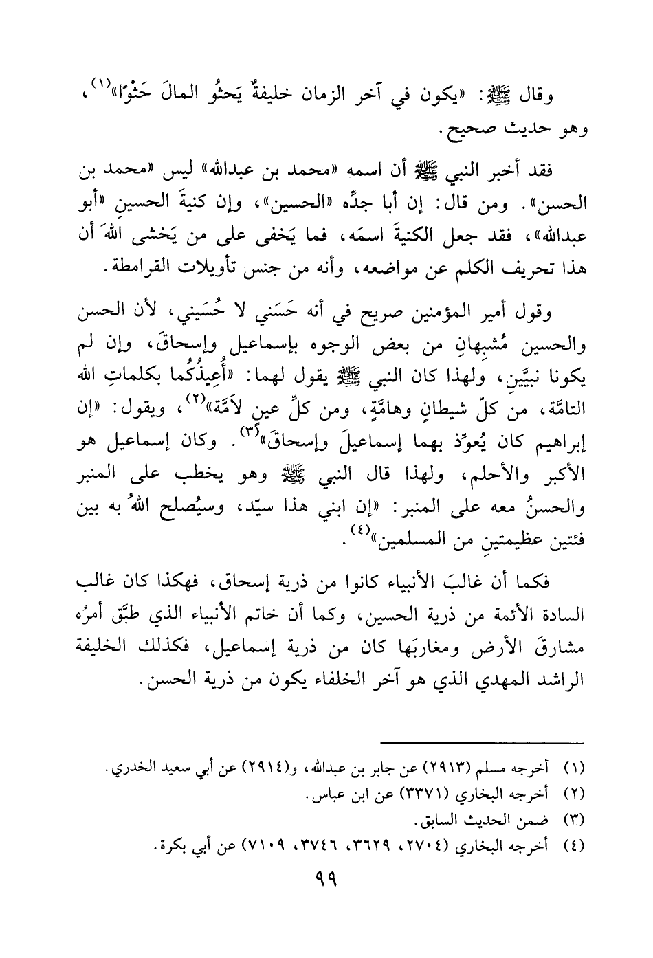 فقد أخبر النبي - صَلَّى اللَّهُ عَلَيْهِ وَسَلَّمَ - أن اسمه "محمد بن عبد الله" ليس "محمد بن الحسن". ومن قال: إن أبا جدِّه "الحسين"، وإن كنيةَ الحسينِ "أبو عبد الله"، فقد جعل الكنيةَ اسمَه، فما يَخفى على من يَخشى الله أن هذا تحريف الكلم عن مواضعه، وأنه من جنس تأويلات القرامطة.