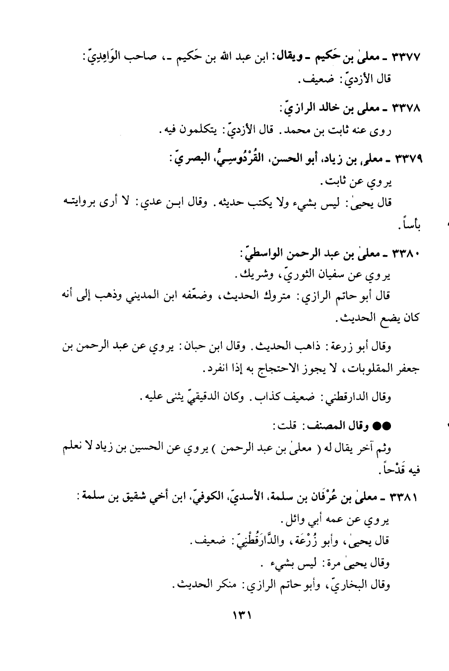 3381 - مُعلى بن عرفان بن سَلمَة الْأَسدي الْكُوفِي ابْن أخي شَقِيق بن سَلمَة يروي عَن عَمه أبي وَائِل قَالَ يحيى وَأَبُو زرْعَة وَالدَّارَقُطْنِيّ ضَعِيف وَقَالَ يحيى مرّة لَيْسَ بِشَيْء وَقَالَ البُخَارِيّ وَأَبُو حَاتِم الرَّازِيّ مُنكر الحَدِيث وَقَالَ النَّسَائِيّ والأزدي مَتْرُوك الحَدِيث وَقَالَ ابْن حبَان يروي الموضوعات عَن الْأَثْبَات لَا يحل الِاحْتِجَاج بِهِ