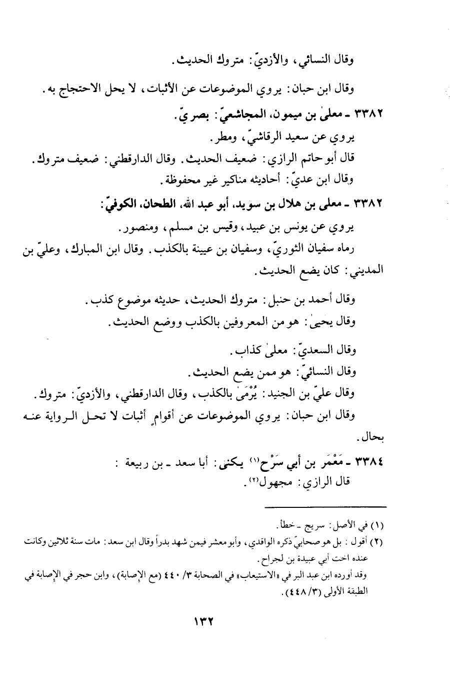 3382 - مُعلى بن هِلَال بن سُوَيْد أَبُو عبد الله الطَّحَّان الْكُوفِي يروي عَن يُونُس بن عبيد وَقيس بن مُسلم وَمَنْصُور رَمَاه سُفْيَان الثَّوْريّ وسُفْيَان بن عُيَيْنَة بِالْكَذِبِ وَقَالَ ابْن الْمُبَارك وَعلي بن الْمَدِينِيّ كَانَ يضع الحَدِيث وَقَالَ أَحْمد بن حَنْبَل مَتْرُوك الحَدِيث حَدِيثه مَوْضُوع كذب وَقَالَ يحيى هُوَ من المعروفين بِالْكَذِبِ وَوضع الحَدِيث وَقَالَ السَّعْدِيّ مُعلى كَذَّاب وَقَالَ النَّسَائِيّ هُوَ مِمَّن يضع الحَدِيث وَقَالَ عَليّ بن الْجُنَيْد يروي بِالْكَذِبِ وَقَالَ الدراقطني والأزدي مَتْرُوك وَقَالَ ابْن حبَان يروي الموضوعات عَن أَقوام أثبات لَا تحل الرِّوَايَة عَنهُ بِحَال
