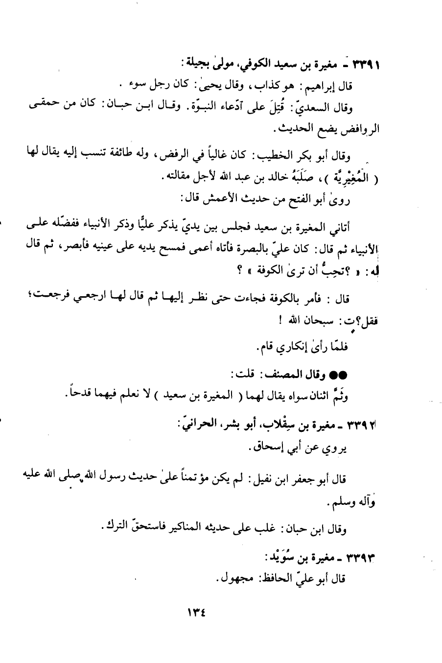 3391 - مُغيرَة بن سعيد الْكُوفِي مولى بجيلة قَالَ أبراهيم هُوَ كَذَّاب وَقَالَ يحيى كَانَ رجل سوء وَقَالَ السَّعْدِيّ قتل على ادِّعَاء النُّبُوَّة وَقَالَ ابْن حبَان كَانَ من حمقى الروافض يضع الحَدِيث وَقَالَ أَبُو بكر الْخَطِيب كَانَ غاليا فِي الرَّفْض وَله طَائِفَة تنْسب إِلَيْهِ يُقَال لَهَا (المغيرية) صلبه خَالِد بن عبد الله لأجل مقَالَته روى أَبُو الْفَتْح من حَدِيث الْأَعْمَش قَالَ أَتَانِي الْمُغيرَة بن سعيد فَجَلَسَ بَين يَدي يذكر عليا وَذكر الْأَنْبِيَاء ففصله على الْأَنْبِيَاء ثمَّ قَالَ كَانَ عَليّ بِالْبَصْرَةِ فَأَتَاهُ أعمى فَمسح يَدَيْهِ على عَيْنَيْهِ فأبصر ثمَّ قَالَ لَهُ ((أَتُحِبُّ أَن ترى الْكُوفَة)) قَالَ فَأمر بِالْكُوفَةِ فَجَاءَت حَتَّى نظر إِلَيْهَا ثمَّ قَالَ لَهَا ارجعي فَرَجَعت فَقلت سُبْحَانَ الله فَلَمَّا رأى إنكاري قَامَ وَقَالَ المُصَنّف قلت وَثمّ اثْنَان سواهُ يُقَال لَهما (الْمُغيرَة بن سعيد) لَا نعلم فيهمَا قدحا