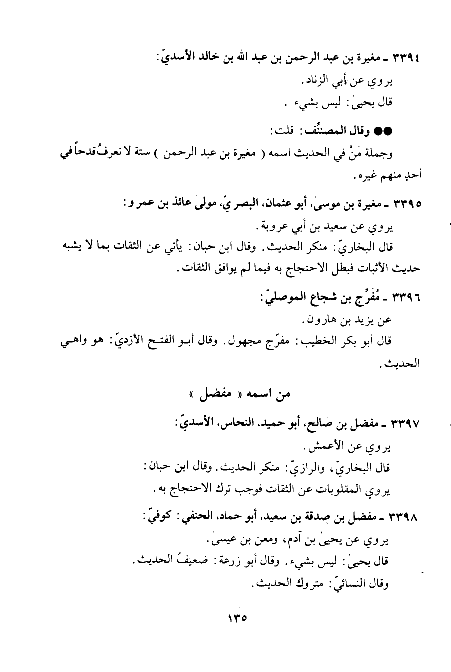 3397 - مفضل بن صَالح أَبُو حميد النّحاس الْأَسدي يروي عَن الْأَعْمَش قَالَ البُخَارِيّ والرازي مُنكر الحَدِيث وَقَالَ ابْن حبَان يروي المقلوبات عَن الثِّقَات فَوَجَبَ ترك الِاحْتِجَاج بِهِ