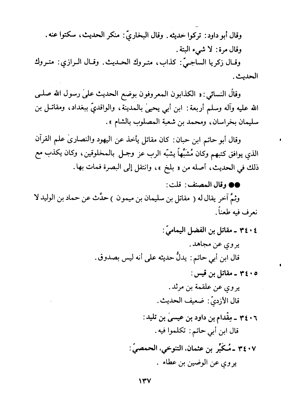وَقَالَ أَبُو دَاوُد تركُوا حَدِيثه وَقَالَ البُخَارِيّ مُنكر الحَدِيث سكتوا عَنهُ وَقَالَ مرّة لَا شَيْء الْبَتَّةَ وَقَالَ زَكَرِيَّا السَّاجِي كَذَّاب مَتْرُوك الحَدِيث وَقَالَ الرَّازِيّ مَتْرُوك الحَدِيث وَقَالَ النَّسَائِيّ ((الكذابون المعروفون بِوَضْع الحَدِيث على رَسُول الله صلى الله عَلَيْهِ وَسلم وَآله وَسلم أَرْبَعَة ابْن أبي يحيى بِالْمَدِينَةِ والواقدي بِبَغْدَاد وَمُقَاتِل بن سُلَيْمَان بخراسان وَمُحَمّد بن شُعْبَة الكصلوب بِالشَّام)) وَقَالَ أَبُو حَاتِم ابْن حبَان كَانَ مقَاتل يَأْخُذ عَن الْيَهُود وَالنَّصَارَى علم الْقُرْآن الَّذِي يُوَافق كتبهمْ وَكَانَ مشبها يشبه الرب عز وَجل بالمخلوقين وَكَانَ يكذب مَعَ ذَلِك فِي الحَدِيث أَصله من ((بَلخ)) وانتقل إِلَى الْبَصْرَة فَمَاتَ بهَا وَقَالَ المُصَنّف قلت وَثمّ آخر يُقَال لَهُ (مقَاتل بن سُلَيْمَان بن مَيْمُون) حدث عَن حَمَّاد بن الْوَلِيد لَا نَعْرِف فِيهِ طَعنا