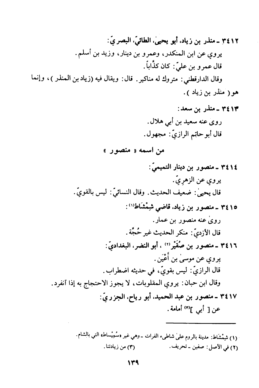 3415 - مَنْصُور بن زِيَاد قَاضِي شمشاط روى عَنهُ مَنْصُور بن عمار قَالَ الْأَزْدِيّ مُنكر الحَدِيث غير حجَّة