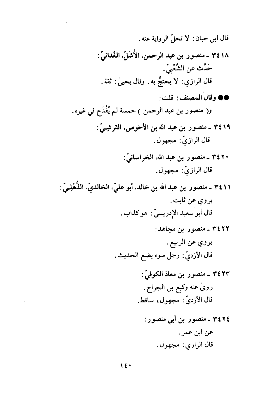 3418 - مَنْصُور بن عبد الرَّحْمَن الأشل الغداني حدث عَن الشّعبِيّ قَالَ الرَّازِيّ لَا يحْتَج بِهِ وَقَالَ يحيى ثِقَة وَقَالَ المُصَنّف قلت و (مَنْصُور بن عبد الرَّحْمَن) خَمْسَة لم يقْدَح فِي غَيره