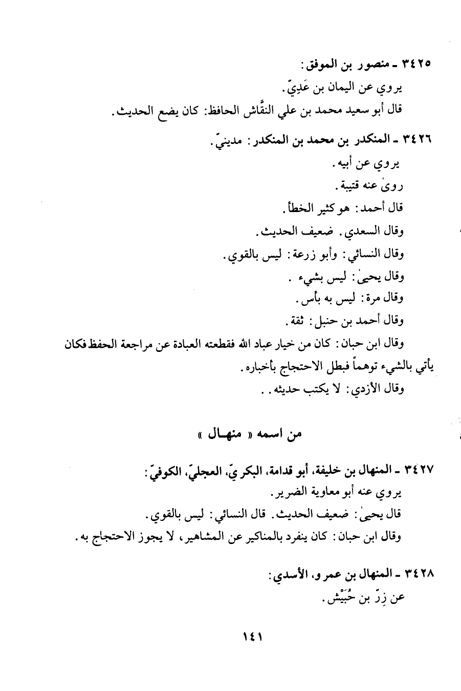 3428 - الْمنْهَال بن عَمْرو الْأَسدي عَن زر بن حُبَيْش قَالَ أَحْمد تَركه شُعْبَة على عمد وَقَالَ يحيى ثِقَة قَالَ المُصَنّف قلت وَثمّ آخر يُقَال لَهُ (الْمنْهَال بن عَمْرو) حدث عَن شُعْبَة لَا نَعْرِف فِيهِ قدحا وَقد ذكرنَا الْجراح بن الْمنْهَال وَأَن ابْن إِسْحَاق كَانَ يقلب إسمه فَيَقُول الْمنْهَال بن الْجراح فَرُبمَا جَاءَ كَذَا فَيعلم
