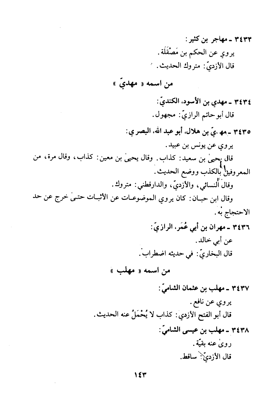 3435 - مهْدي بن هِلَال أَبُو عبد الله الْبَصْرِيّ يروي عَن يُونُس بن عبيد قَالَ يحيى بن سعيد كَذَّاب وَقَالَ يحيى بن معِين كَذَّاب وَقَالَ مرّة من المعروفين بِالْكَذِبِ وَوضع الحَدِيث وَقَالَ النَّسَائِيّ والأزدي وَالدَّارَقُطْنِيّ مَتْرُوك وَقَالَ ابْن حبَان يروي الموضوعات عَن الْأَثْبَات حَتَّى خرج عَن حد الِاحْتِجَاج بِهِ