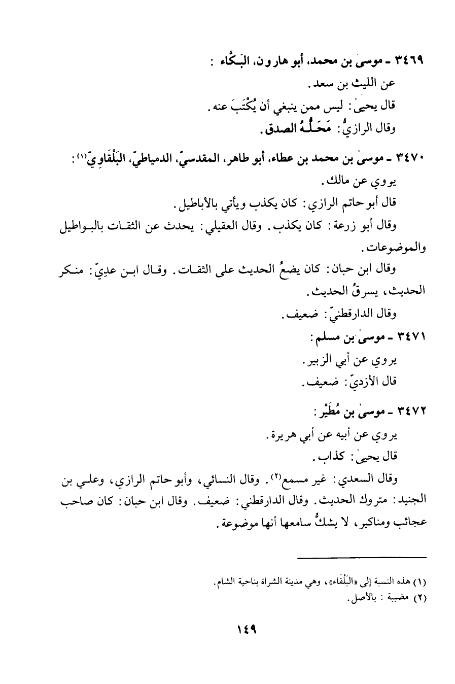 3470 - مُوسَى بن مُحَمَّد بن عَطاء أَبُو طَاهِر الْمَقْدِسِي الدمياطي الْبُلْقَاوِيُّ يروي عَن مَالك قَالَ أَبُو حَاتِم الرَّازِيّ كَانَ يكذب وَيَأْتِي بالأباطيل وَقَالَ أَبُو زرْعَة كَانَ يكذب وَقَالَ الْعقيلِيّ يحدث عَن الثِّقَات بِالْبَوَاطِيل والموضوعات وَقَالَ ابْن حبَان كَانَ يضع الحَدِيث على الثِّقَات وَقَالَ ابْن عدي مُنكر الحَدِيث يسرق الحَدِيث وَقَالَ الدَّارَقُطْنِيّ ضَعِيف
