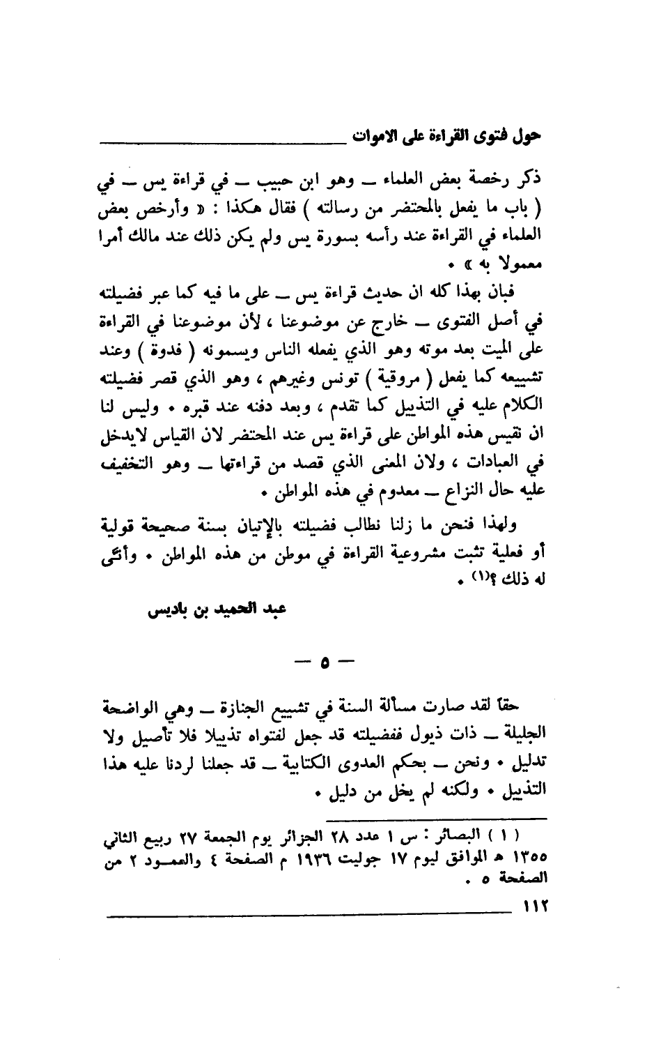 فبان بهذا كله أن حديث قراءة يس- على ما فيه كما عبر فضيلته في أصل الفتوى - خارج عن موضوعنا، لأن موضوعنا في القراءة على الميت بعد موته وهو الذي يفعله الناس ويسمونه (فدوة) وعند تشييعه كما يفعل (مروقية) تونس وغيرهم، وهو الذي قصر فضيلته الكلام عليه في التذييل كما تقدم، وبعد دفنه عند قبره. وليس لنا أن نقيس هذه المواطن على قراءة يس عند المحتضر لأن القياس لا يدخل في العبادات، ولأن المعنى الذي قصد من قراءتها- وهو التخفيف، عليه حال النزاع- معدوم في هذه المواطن.