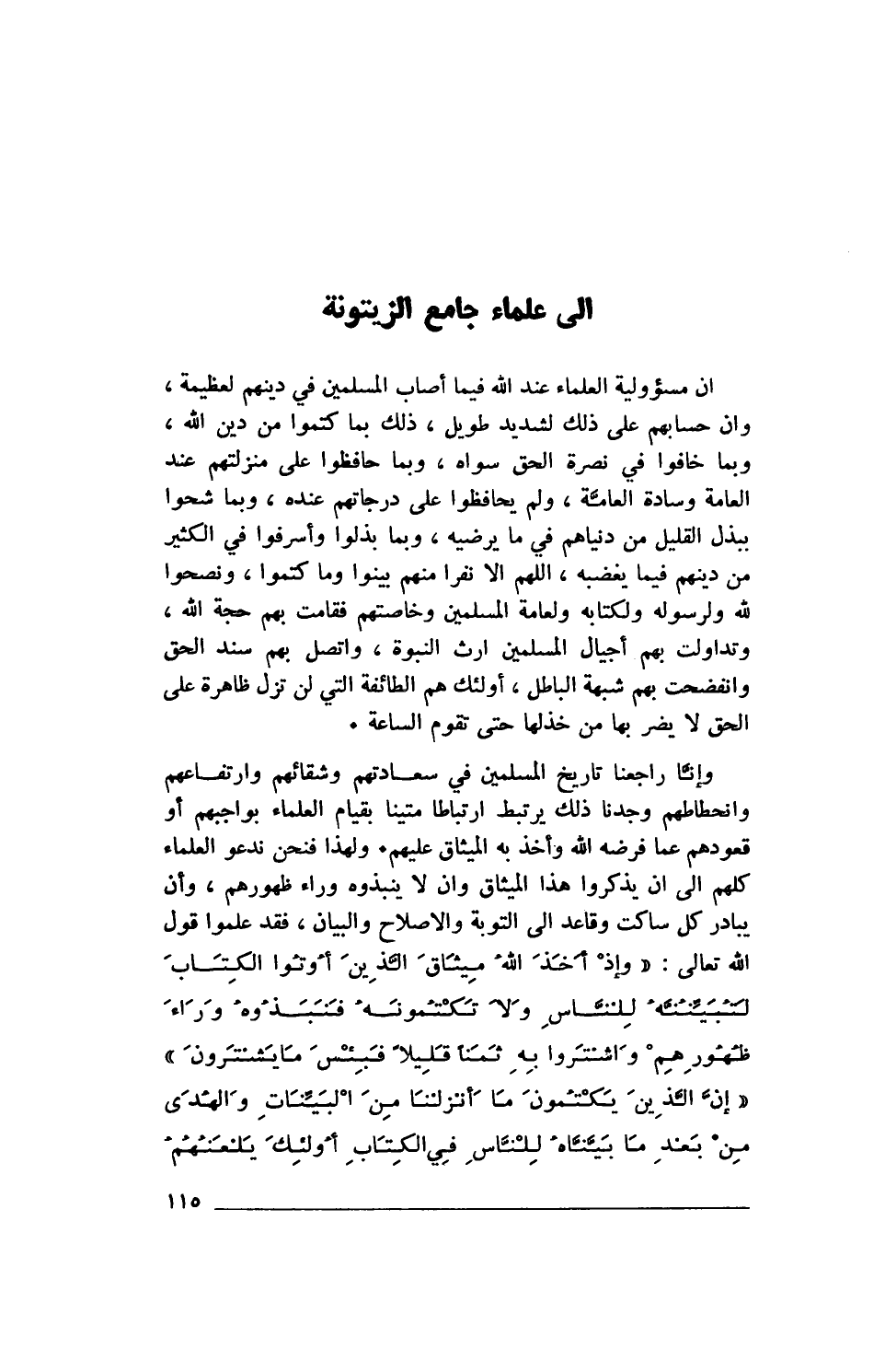 وإنَّا راجعنا تاريخ المسلمين في سعادتهم وشقائهم وارتفاعهم وانحطاطهم وجدنا ذلك يرتبط ارتباطا متينا بقيام العلماء بواجبهم أو قعودهم عما فرضه الله وأخذ به الميثاق عليهم. ولهذا فنحن ندعو العلماء كلهم إلى أن يذكروا هذا الميثاق وأن لا ينبذوه وراء ظهورهم، وأن يبادر كل ساكت وقاعد إلى التوبة والإصلاح والبيان، فقد علموا قول الله تعالى: {وَإِذْ أَخَذَ اللَّهُ مِيثَاقَ الَّذِينَ أُوتُوا الْكِتَابَ لَتُبَيِّنُنَّهُ لِلنَّاسِ وَلَا تَكْتُمُونَهُ فَنَبَذُوهُ وَرَاءَ ظُهُورِهِمْ وَاشْتَرَوْا بِهِ ثَمَنًا قَلِيلًا فَبِئْسَ مَا يَشْتَرُونَ} {إِنَّ الَّذِينَ يَكْتُمُونَ مَا أَنْزَلْنَا مِنَ الْبَيِّنَاتِ وَالْهُدَى مِنْ بَعْدِ مَا بَيَّنَّاهُ لِلنَّاسِ فِي الْكِتَابِ أُولَئِكَ يَلْعَنُهُمُ