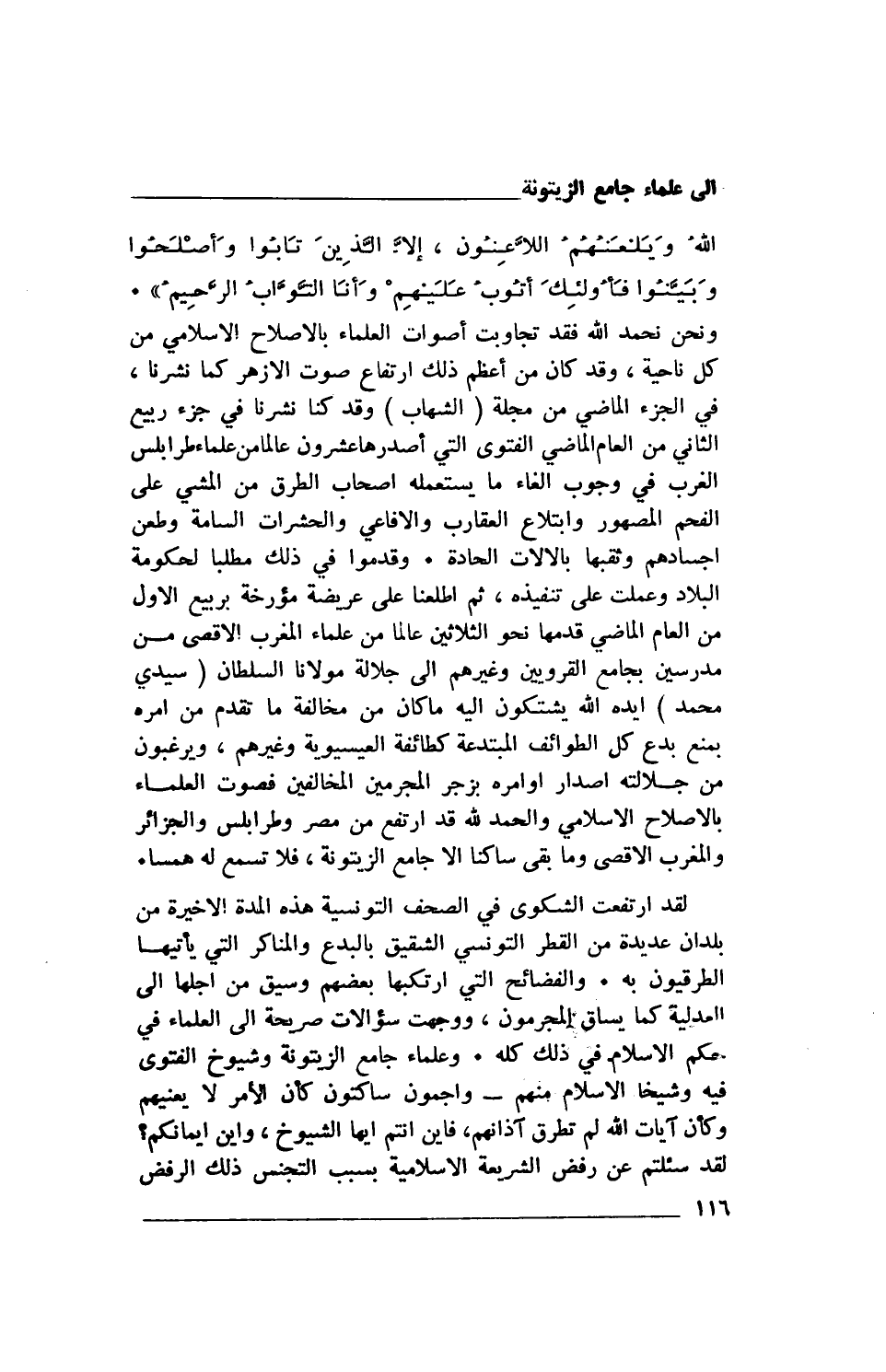 ونحن نحمد الله فقد تجاوبت أصوات العلماء بالإصلاح الإسلامي من كل ناحية، وقد كان من أعظم ذلك ارتفاع صوت الأزهر كما نشرنا، في الجزء الماضي من مجلة (الشهاب) وقد كنا نشرنا في جزء ربيع الثاني من العام الماضي الفتوى التي أصدرها عشرون عالما من علماء طرابلس الغرب في وجوب إلغاء ما يستعمله أصحاب الطرق من المشي على الفحم المصهور وابتلاع العقارب والأفاعي والحشرات السامة وطعن أجسادهم وثقبها بالالات الحادة. وقدموا في ذلك مطلبا لحكومة البلاد وعملت على تنفيذه، ثم اطلعنا على عريضة مؤرخة بربيع الأول من العام الماضي قدمها نحو الثلاثين عالما من علماء المغرب الأقصى من مدرسين بجامع القرويين وغيرهم إلى جلالة مولانا السلطان (سيدي محمد) أيده الله يشتكون إليه ما كان من مخالفة ما تقدم من أمره بمنع بدع كل الطوائف المبتدعة كطائفة العيسيوية وغيرهم، ويرغبون من جلالته إصدار أوامره بزجر المجرمين المخالفين فصوت العلماء بالإصلاح الإسلامي والحمد لله قد ارتفع من مصر وطرابلس والجزائر والغرب الأقصى وما بقي ساكنا إلا جامع الزيتونة، فلا تسمع له همسا.