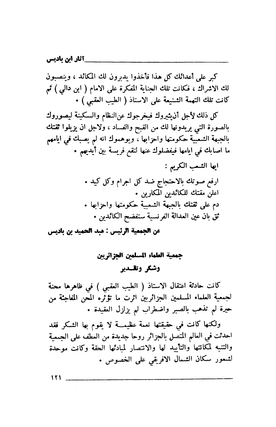 عن الجمعية الرئيس: عبد الحميد بن باديس