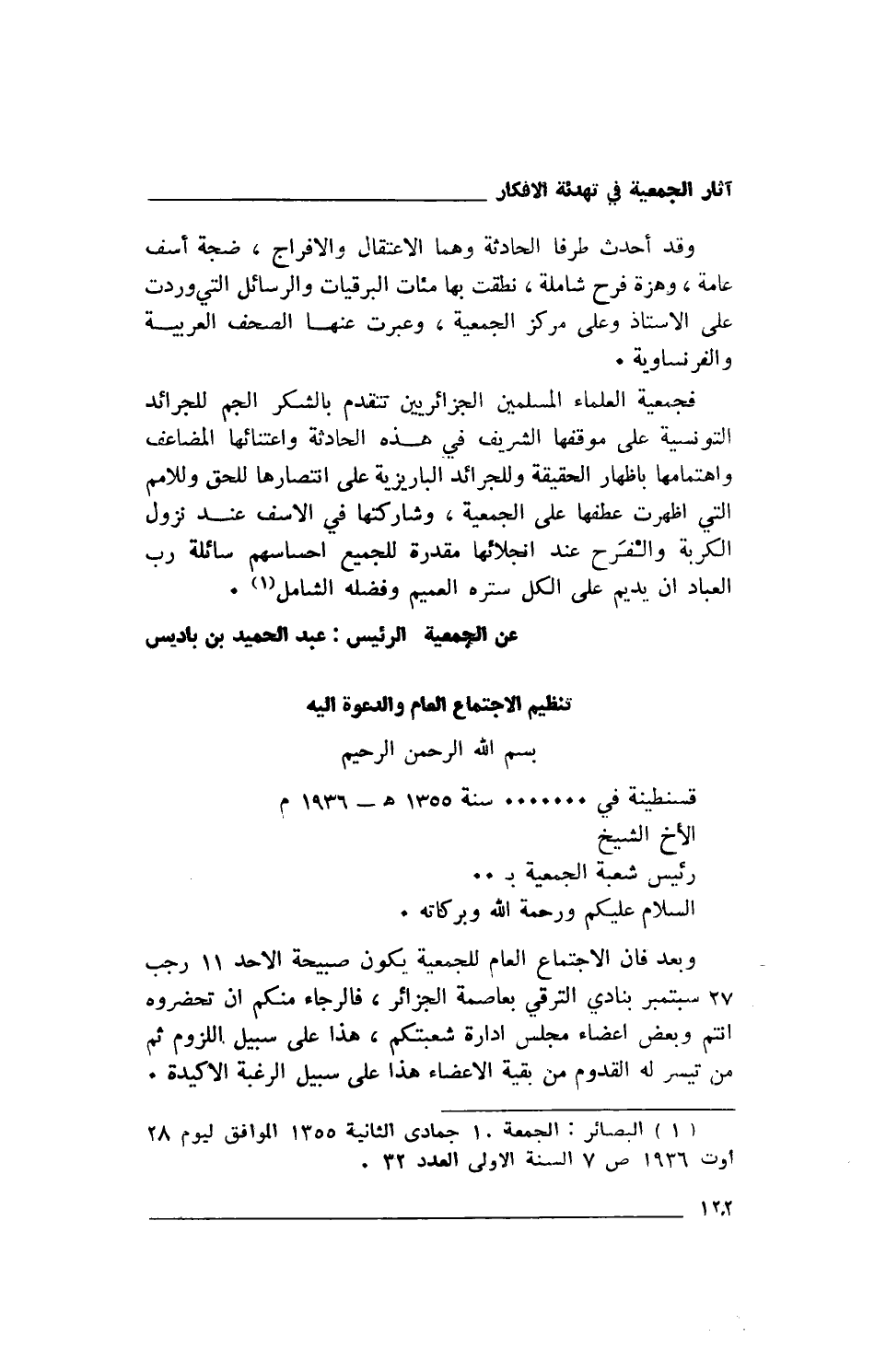 (1) البصائر: الجمعة 10 جمادى الثانية 1355 الموافق ليوم 28 أوت 1936 ص7 السنة الأولى العدد 32.