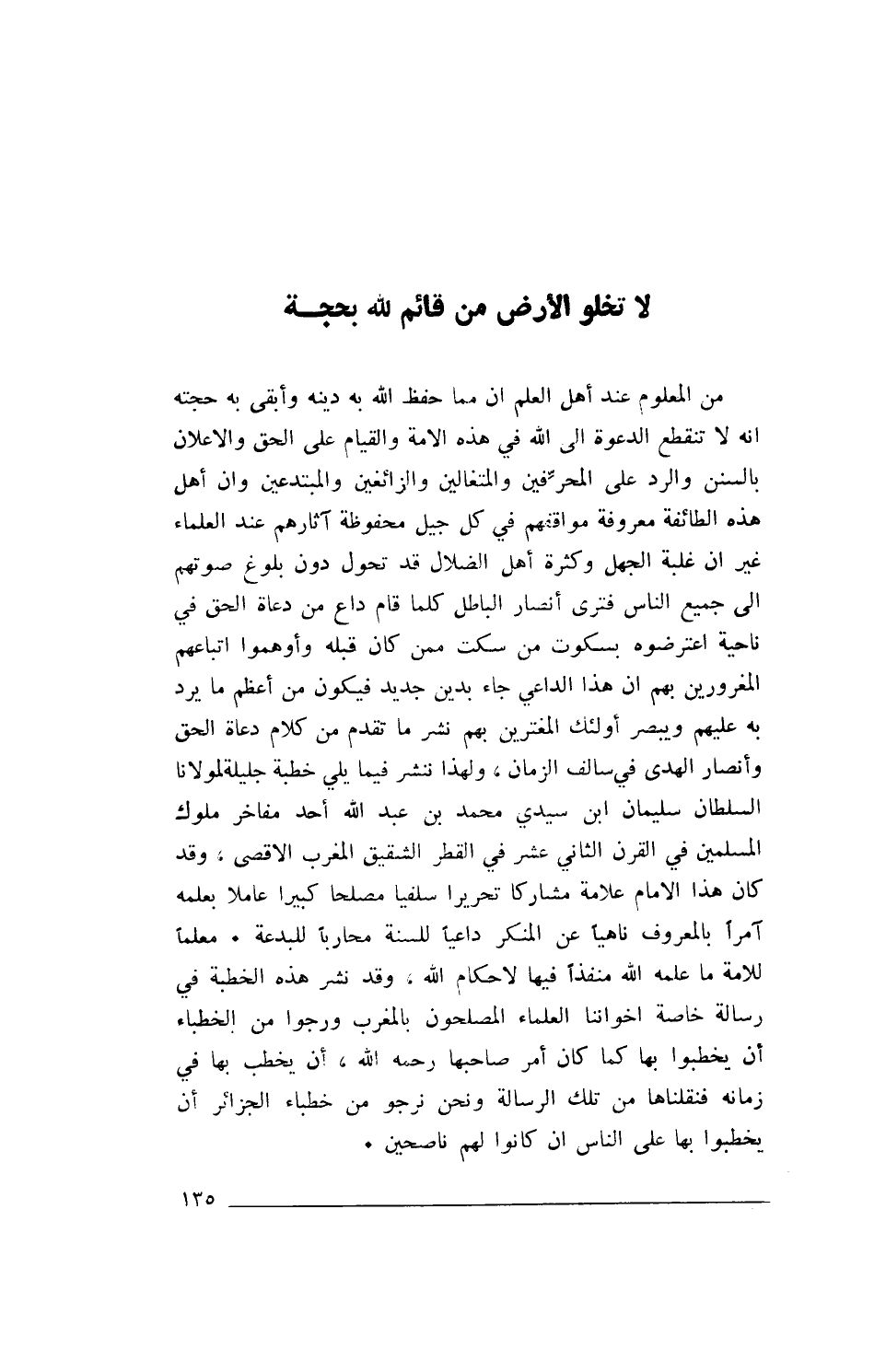 من المعلوم عند أهل العلم أن مما حفط الله به دينه وأبقى به حجته أنه لا تنقطع الدعوة إلى الله في هذه الأمة والقيام على الحق والإعلان بالسنن والرد على المحرِّفين والمتغالين والزائغين والمبتدعين وأن أهل هذه الطائفة معروفة مواقفهم في كل جيل محفوظة آثارهم عند العلماء غير ان غلبة الجهل وكثرة أهل الضلال قد تحول دون بلوغ صوتهم إلى جميع الناس فترى أنصار الباطل كلما قام داع من دعاة الحق في ناحية اعترضوه بسكوت من سكت ممن كان قبله وأوهموا اتباعهم المغرورين بهم أن هذا الداعي جاء بدين جديد فيكون من أعظم ما يرد به عليهم ويبصر أولئك المغترين بهم نشر ما تقدم من كلام دعاة الحق وأنصار الهدى في سالف الزمان، ولهذا ننشر فيما يلي خطبة جليلة لمولانا السلطان سليمان ابن سيدي محمد بن عبد الله أحد مفاخر ملوك المسلمين في القرن الثاني عشر في القطر الشقيق المغرب الأقصى، وقد كان هذا الإمام علامة مشاركا تحريرا سلفيا مصلحا كبيرا عاملا بعلمه آمرا بالمعروف ناهيا عن المنكر داعياً للسنة محارباً للبدعة. معلماً للأمة ما علمه الله منفذاً فيها لأحكام الله، وقد نشر هذه الخطبة في رسالة خاصة إخواننا العلماء المصلحون بالمغرب ورجوا من الخطباء أن يخطبوا بها كما كان أمر صاحبها رحمه الله، أن يخطب بها في زمانه فنقلناها من تلك الرسالة ونحن نرجو من خطباء الجزائر أن يخطبوا بها على الناس إن كانوا لهم ناصحين.