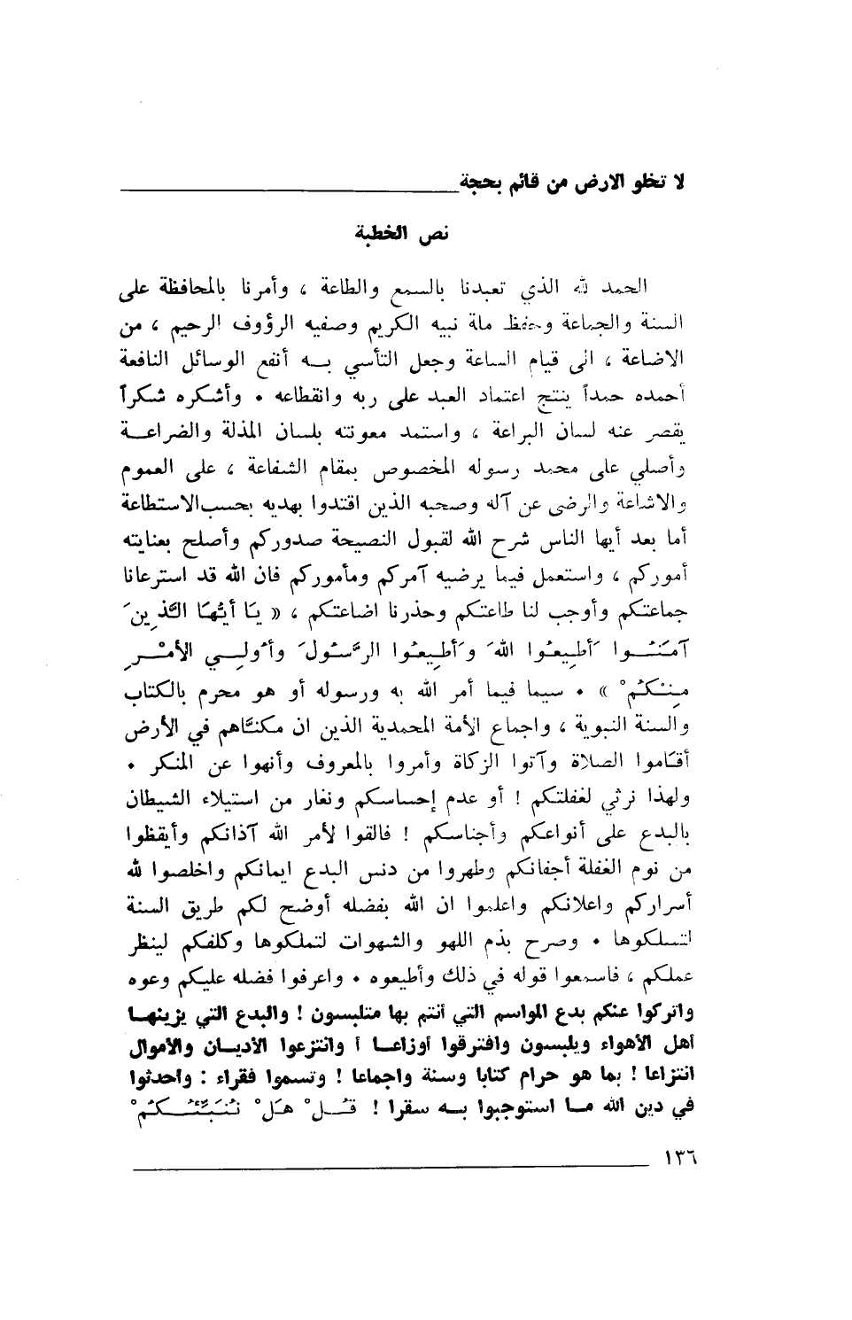 الحمد لله الذي تعبدنا بالسمع والطاعة، وأمرنا بالمحافظة على السنة والجماعة وحفظ ملة نبيه الكريم وصفيه الرؤوف الرحيم، من الإضاعة، إلى قيام الساعة وجعل التأسي به أنفع الوسائل النافعة أحمده حمداً ينتج اعتماد العبد على ربه وانقطاعه. وأشكره شكراً يقصر عنه لسان البراعة، وأستمد معونته بلسان الذلة والضراعة وأصلي على محمد رسوله المخصوص بمقام الشفاعة، على العموم والإشاعة والرضى عن آله وصحبه الذين اقتدوا بهديه حسب الاستطاعة أما بعد أيها الناس شرح الله لقبول النصيحة صدوركم وأصلح بعنايته أموركم، واستعمل فيما يرضيه آمركم ومأموركم فإن الله قد استرعانا جماعتكم وأوجب لنا طاعتكم وحذرنا إضاعتكم، {يَا أَيُّهَا الَّذِينَ آمَنُوا أَطِيعُوا اللَّهَ وَأَطِيعُوا الرَّسُولَ وَأُولِي الْأَمْرِ مِنْكُمْ}. سيما فيما أمر الله به ورسوله أو هو محرم بالكتاب والسنة النبوية، وإجماع الأمة المحمدية الذين إن مكناهم في الأرض أقَاموا الصلاة وآتوا الزكاة وأمروا بالمعروف ونهوا عن المنكر. ولهذا نرثي لغفلتكم! أو عدم إحساسكم ونغار من استيلاء الشيطان بالبدع على أنواعكم وأجناسكم! فألقوا لأمر الله آذانكم وأيقظوا من نوم الغفلة أجفانكم وطهروا من دنس البدع إيمانكم وأخلصوا لله أسراركم وإعلانكم واعلموا أن الله بفضله أوضح لكم طريق السنة لتسلكوها. وصرح بذم اللهو والشهوات لتملكوها وكلفكم لينظر عملكم، فاسمعوا قوله في ذلك وأطيعوه. واعرفوا فضله عليكم وعوه واتركوا عنكم بدع المواسم التي أنتم بها متلبسون! والبدع التي يزينها أهل الأهواء ويلبسون وافترقوا أوزاعا! وانتزعوا الأديان والأمول انتزاعا بما هو حرام كتابا وسنة واجماعا! وتسموا فقراء: وأحدثوا في دين الله ما استوجبوا به سقرا! {قُلْ هَلْ نُنَبِّئُكُمْ