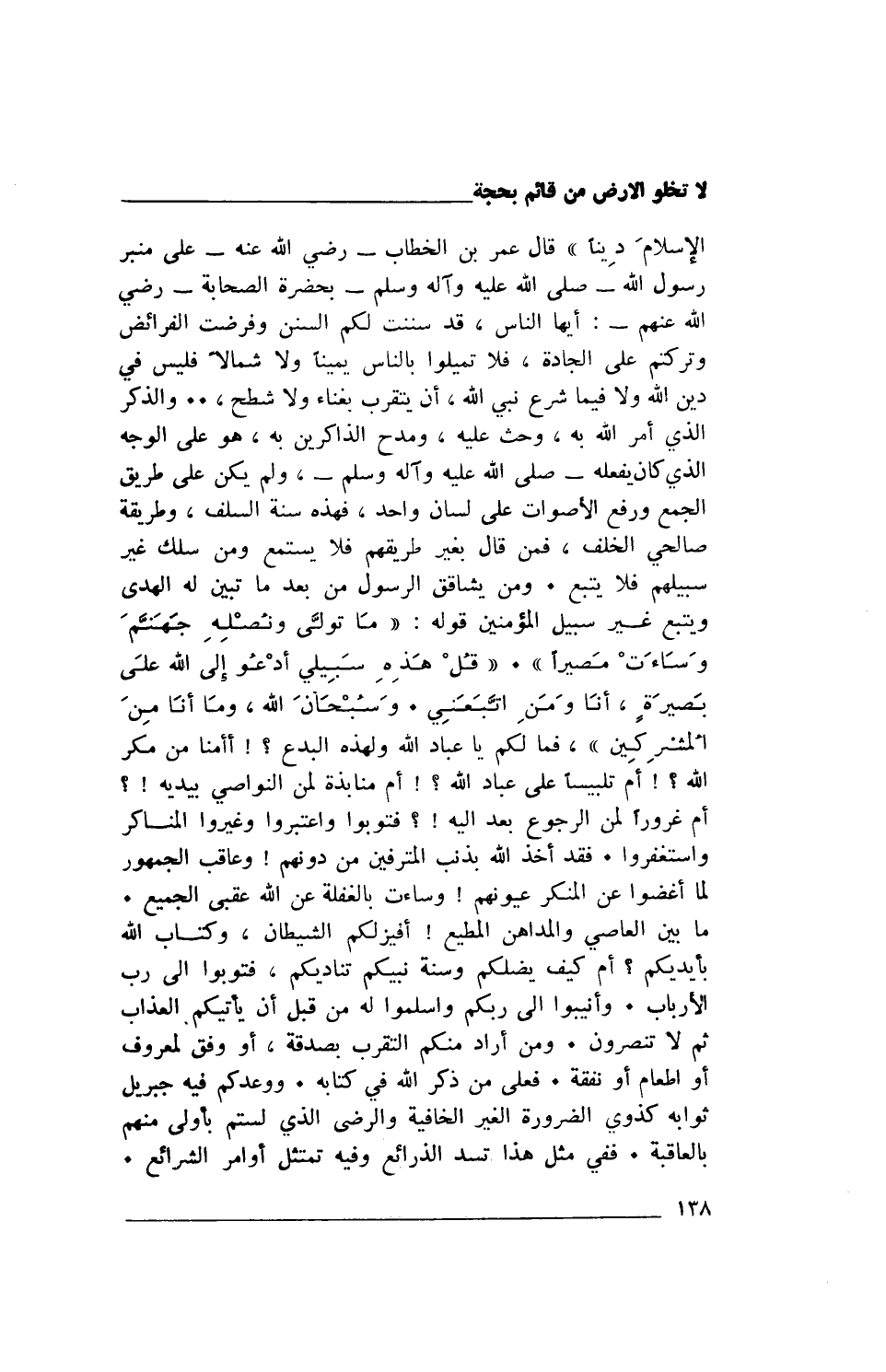 الْإِسْلَامَ دِينًا} قال عمر بن الخطاب- رضي الله عنه- على منبر رسول الله- صلى الله عليه وآله وسلم- بحضرة الصحابة- رضي الله عنهم-: أيها الناس، قد سننت لكم السنن وفرضت الفرائض وتركتم على الجادة، فلا تميلوا بالناس يميناً ولا شمالاً فليس في دين الله ولا فيما شرع نبي الله، أن يتقرب بغناء ولا شطح، .. والذكر- الذي أمر الله به، وحث عليه، ومدح الذاكرين به، هو على الوجه الذي كان يفعله- صلى الله عليه وآله وسلم-، ولم يكن على طريق الجمع ورفع الأصوات على لسان واحد، فهذه سنة السلف، وطريقة صالحي الخلف، فمن قال بغير طريقهم فلا يستمع ومن سلك غير سبيلهم فلا يتبع ومن يشاقق الرسول من بعد ما تبين له الهدى ويتبع غير سبيل المؤمنين قوله: {مَا تَوَلَّى وَنُصْلِهِ جَهَنَّمَ وَسَاءَتْ مَصِيرًا}. {قُلْ هَذِهِ سَبِيلِي أَدْعُو إِلَى اللَّهِ عَلَى بَصِيرَةٍ أَنَا وَمَنِ اتَّبَعَنِي وَسُبْحَانَ اللَّهِ وَمَا أَنَا مِنَ الْمُشْرِكِينَ}، فما لكم يا عباد الله ولهذه البدع؟! أأمنا من مكر الله؟! أم تلبيساً على عباد الله؟! أم منابذة لمن النواصي بيديه!؟ أم غرورا لمن الرجوع بعد إليه!؟ فتوبوا واعتبروا وغيروا المناكر واستغفروا. فقهد أخذ الله بذنب المترفين من دونهم! وعاقب الجمهور لما أغضوا عن المنكر عيونهم! وساءت بالغفلة عن الله عقبى الجميع. ما بين العاصي والمداهن المطيع! أفيزلكم الشيطان، وكتاب الله بأيديكم؟ أم كيف يضلكم وسنة نبيكم تناديكم، فتوبوا إلى رب الأرباب. وأنيبوا إلى ربكم وأسلموا له من قبل أن يأتيكم العذاب ثم لا تنصرون. ومن أراد منكم التقرب بصدقة، أو وفق لمعروف أو إطعام أو نفقة. فعلى من ذكر الله في كتابه. ووعدكم فيه جبريل ثوابه كذوي الضرورة الغير الخافية والرضى الذي لستم بأولى منهم بالعاقبة. ففي مثل هذا تسد الذرائع وفيه تمتثل أوامر الشرائع.