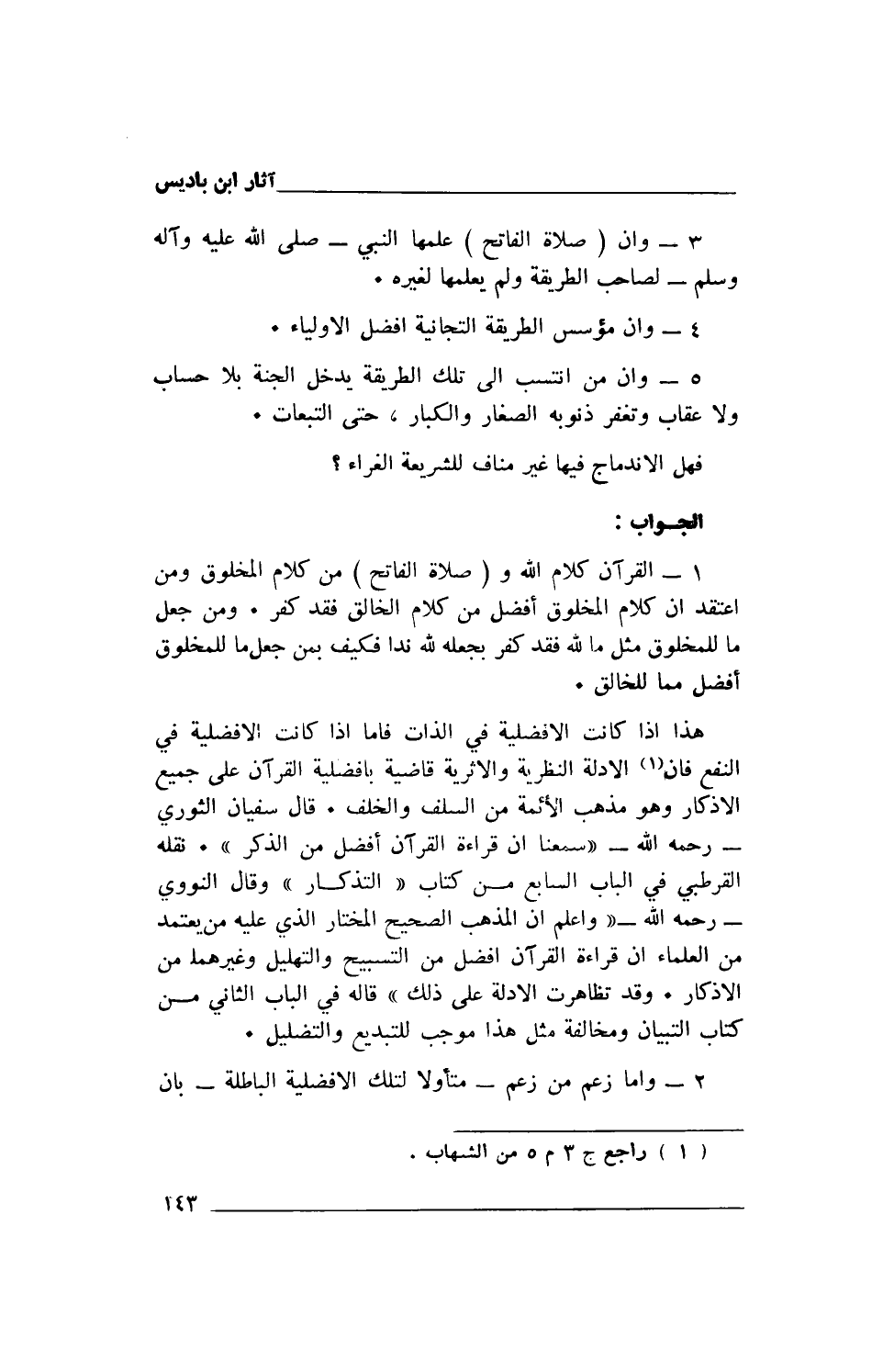 هذا إذا كانت الأفضلية في الذات فأما إذا كانت الأفضلية في النفع فإن (1) الأدلة النظرية والأثرية قاضية بأفضلية القرآن على جميع الأذكار وهو مذهب الأئمة من السلف والخلف. قال سفيان الثوري -رحمه الله- "سمعنا أن قراءة القرآن أفضل من الذكر". نقله القرطبي في الباب السابع منكتاب "التذكار" وقال النووي - رحمه الله - "واعلم أن المذهب الصحيح المختار الذي عليه من يعتمد من العلماء أن قراءة القرآن أفضل من التسبيح والتهليل وغيرهما من الأذكار. وقد تظاهرت الأدلة على ذلك" قاله في الباب الثاني من كتاب التبيان ومخالفة مثل هذا موجب للتبديع والتضليل.