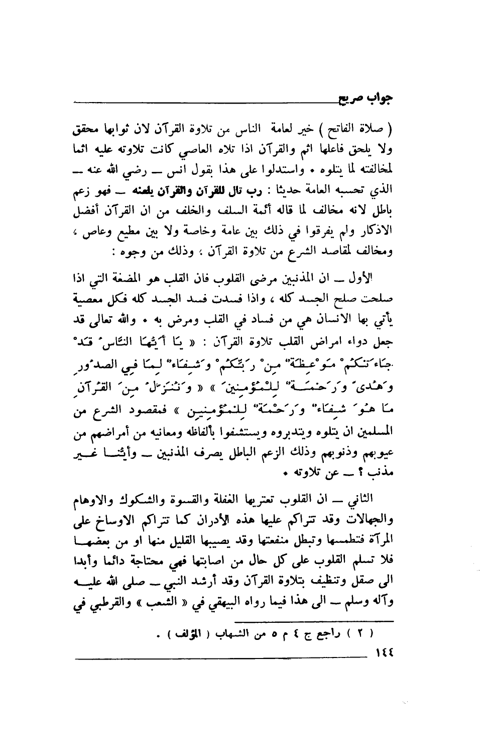 الثاني- أن القلوب تعتريها الغفلة والقسوة والشكوك والأوهام والجهالات وقد تتراكم عليها هذه الأدران كما تتراكم الأوساخ على المرآة فتطمسها وتبطل منفعتها وقد يصيبها القليل منها أو من بعضها فلا تسلم القلوب على كل حال من إصابتها فهي محتاجة دائما وأبدا إلى صقل وتنظيف بتلاوة القرآن وقد أرشد النبي- صلى الله طيه وآله وسلم- إلى هذا فيما رواه البيهقي في "الشعب" والقرطبي في
