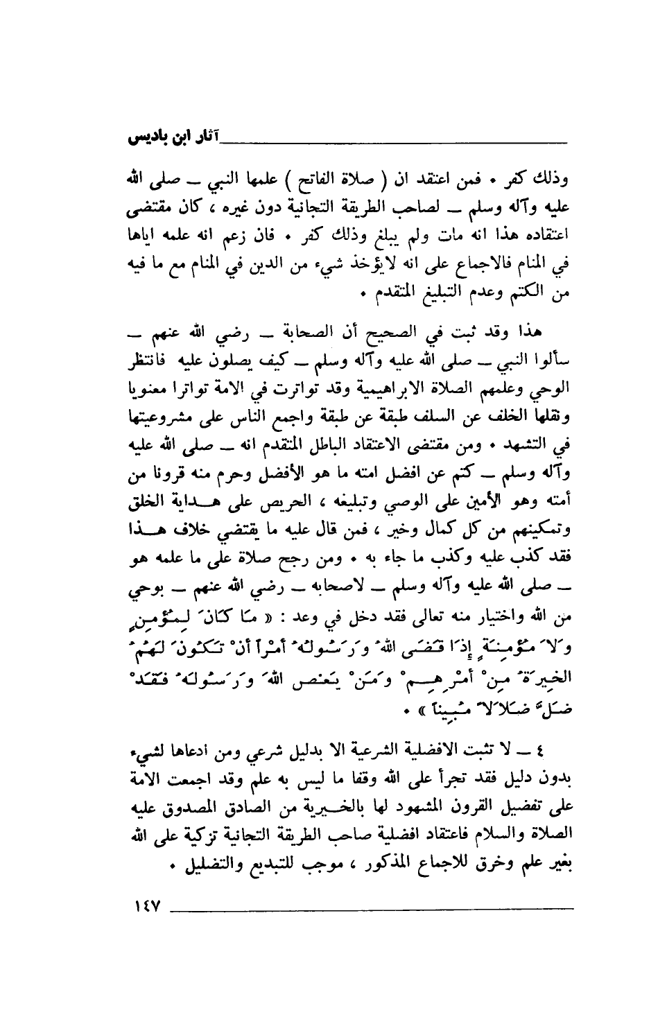 وذلك كفر. فمن اعتقد أن (صلاة الفاتح) علمها النبي- صلى الله عليه وآله وسلم- لصاحب الطريقة التجانية دون غيره، كان مقتضى اعتقاده هذا أنه مات ولم يبلغ وذلك كفر. فإن زعم أنه علمه إياها في المنام فالإجماع على أنه لا يؤخذ شيء من الدين في المنام مع ما فيه من الكتم وعدم التبليغ المتقدم.