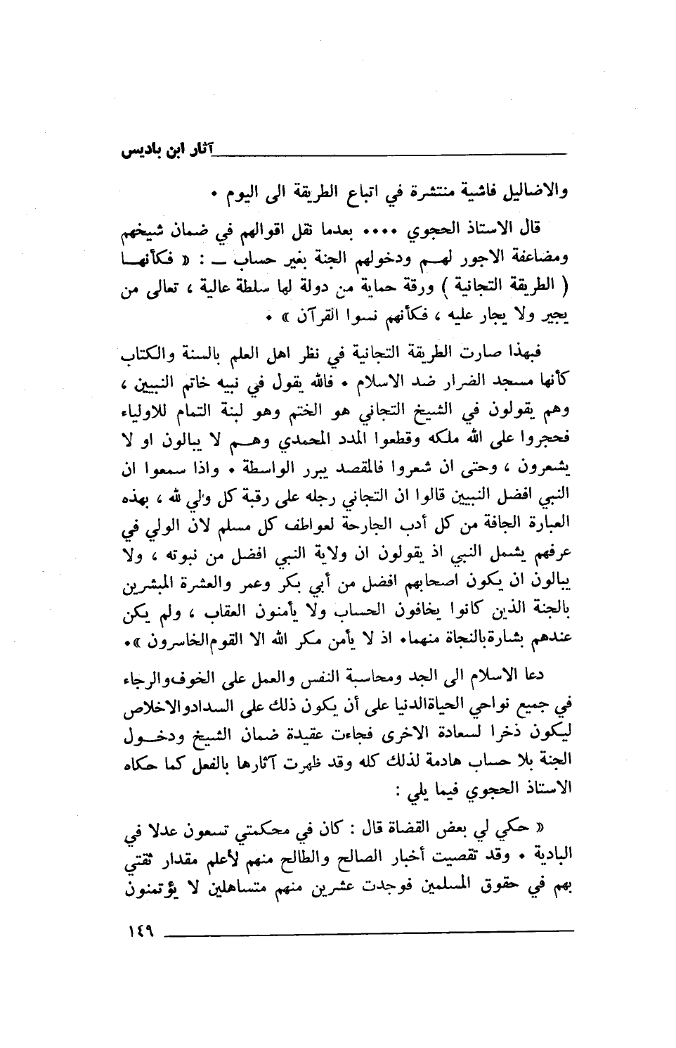 قال الأستاذ الحجوي .... بعدما نقل أقوالهم في ضمان شيخهم ومضاعفة الأجور لهم ودخولهم الجنة بغير حساب-: "فكأنها (الطريقة التجانية) ورقة حماية من دولة لها سلطة عالية، تعالى من يجير ولا يجار عليه، فكأنهم نسوا القرآن".