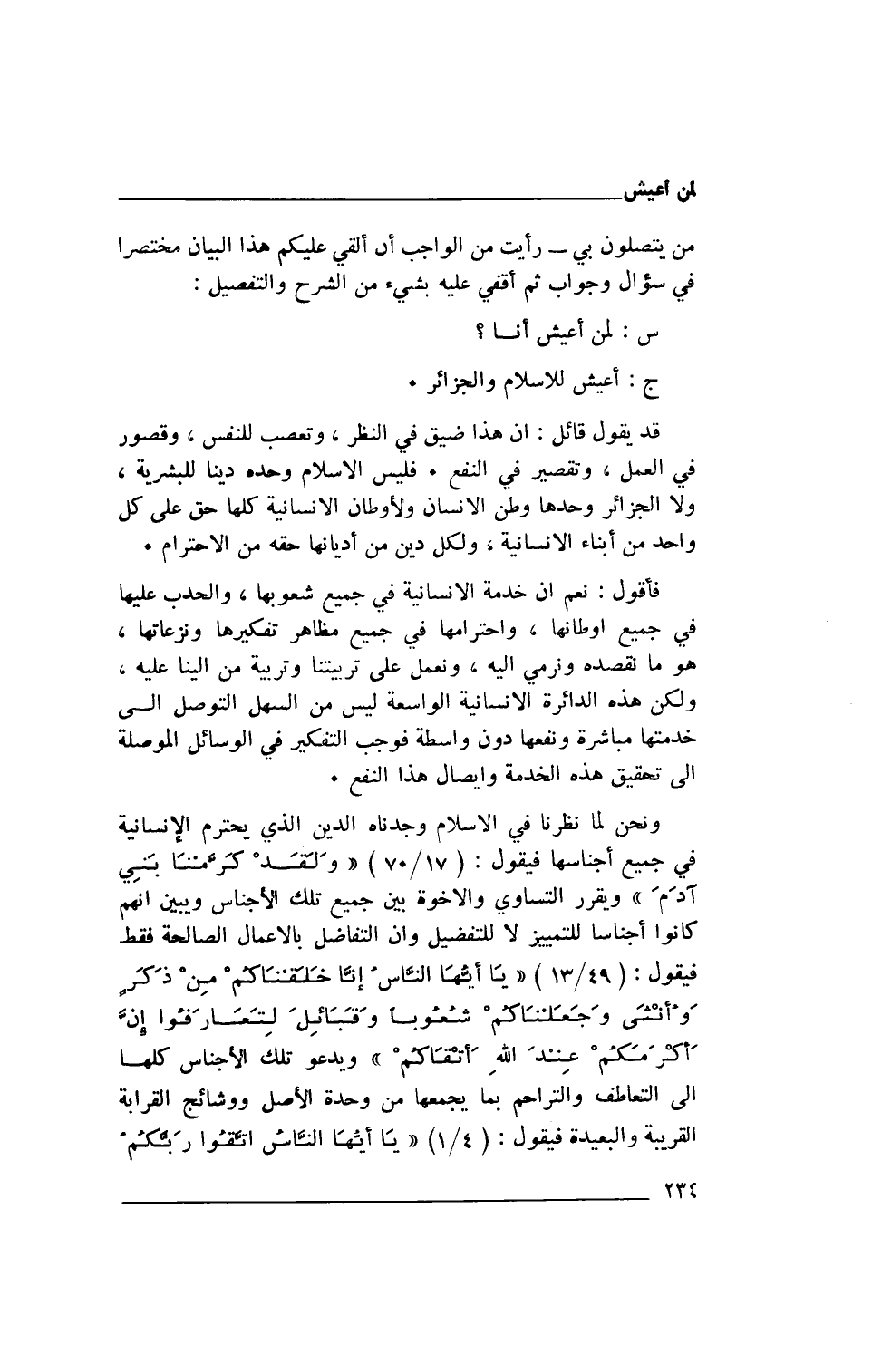 قد يقول قائل: إنّ هذا ضيق في النظر، وتعصب للنفس، وقصور في العمل، وتقصير في النفع. فليس الإسلام وحده ديناً للبشرية، ولا الجزائر وحدها وطن الإنسان ولأوطان الإنسانية كلها حق على كل واحد من أبناء الإنسانية، ولكل دين من أديانها حقه من الاحترام.
