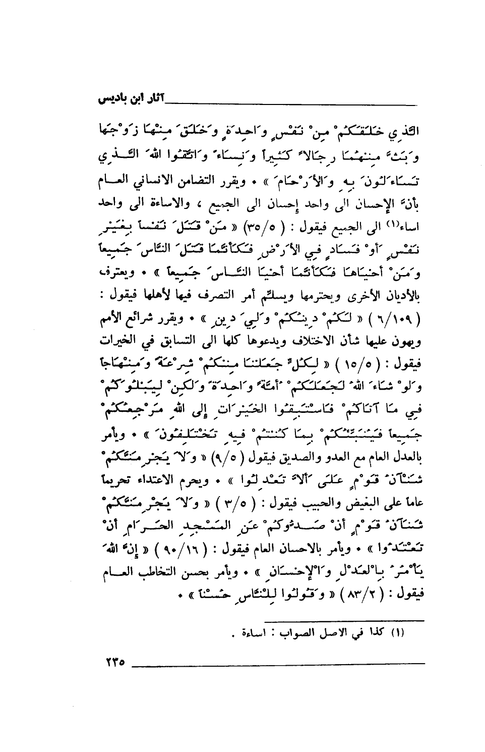 الَّذِي خَلَقَكُمْ مِنْ نَفْسٍ وَاحِدَةٍ وَخَلَقَ مِنْهَا زَوْجَهَا وَبَثَّ مِنْهُمَا رِجَالًا كَثِيرًا وَنِسَاءً وَاتَّقُوا اللَّهَ الَّذِي تَسَاءَلُونَ بِهِ وَالْأَرْحَامَ}. ويقرر التضامن الإنساني العام بأنَّ الإحسان إلى واحد إحسان إلى الجميع، والإساءة إلى واحد اساء (1) إلى الجميع فيقول: (5/ 35) {مَنْ قَتَلَ نَفْسًا بِغَيْرِ نَفْسٍ أَوْ فَسَادٍ فِي الْأَرْضِ فَكَأَنَّمَا قَتَلَ النَّاسَ جَمِيعًا وَمَنْ أَحْيَاهَا فَكَأَنَّمَا أَحْيَا النَّاسَ جَمِيعًا}. ويعترف بالأديان الأخرى ويحترمها ويسلِّم أمر التصرف فيها لأهلها فيقول: (109/ 6) {لَكُمْ دِينُكُمْ وَلِيَ دِينِ}. ويقرر شرائع الأمم ويهون عليها شأن الاختلاف ويدعوها كلها إلى التسابق في الخيرات فيقول: (5/ 15) {لِكُلٍّ جَعَلْنَا مِنْكُمْ شِرْعَةً وَمِنْهَاجًا وَلَوْ شَاءَ اللَّهُ لَجَعَلَكُمْ أُمَّةً وَاحِدَةً وَلَكِنْ لِيَبْلُوَكُمْ فِي مَا آتَاكُمْ فَاسْتَبِقُوا الْخَيْرَاتِ إِلَى اللَّهِ مَرْجِعُكُمْ جَمِيعًا فَيُنَبِّئُكُمْ بِمَا كُنْتُمْ فِيهِ تَخْتَلِفُونَ}. ويأمر بالعدل العام مع العدو والصديق فيقول: (5/ 9) {وَلَا يَجْرِمَنَّكُمْ شَنَآنُ قَوْمٍ عَلَى أَلَّا تَعْدِلُوا}. ويحرم الاعتداء تحريماً عاماً على البغيض والحبيب فيقول: (5/ 3) {وَلَا يَجْرِمَنَّكُمْ شَنَآنُ قَوْمٍ أَنْ صَدُّوكُمْ عَنِ الْمَسْجِدِ الْحَرَامِ أَنْ تَعْتَدُوا}. ويأمر بالإحسان العام فيقول: (16/ 90) {إِنَّ اللَّهَ يَأْمُرُ بِالْعَدْلِ وَالْإِحْسَانِ}. ويأمر بحسن التخاطب العام فيقول: (2/ 83) {وَقُولُوا لِلنَّاسِ حُسْنًا}.