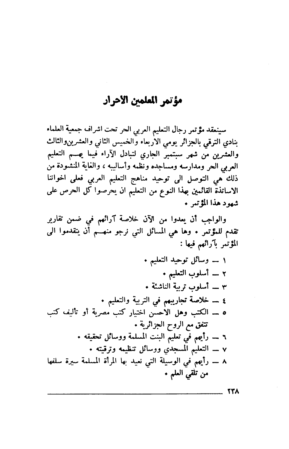 سينعقد مؤتمر رجال التعليم العربي الحر تحت إشراف جمعية العلماء بنادي الترقي بالجزائر يومي الأربعاء والخميس الثاني والعشرين والثالث والعشرين من شهر سبتمبر الجاري لتبادل الآراء فيما يهم التعليم العربي الحر ومدارسه ومساجده ونظمه وأساليبه، والغاية المنشودة من ذلك هي التوصل إلى توحيد مناهج التعليم العربي فعلى إخواننا الأساتذة القائمين بهذا النوع من التعليم أن يحرصوا كل الحرص على شهود هذا المؤتمر.